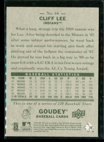 2009 UPPER DECK GOUDEY Baseball Trading Card #64 CLIFF LEE Cleveland Indians