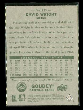 2009 UPPER DECK GOUDEY Baseball Trading Card #125 DAVID WRIGHT New York Mets