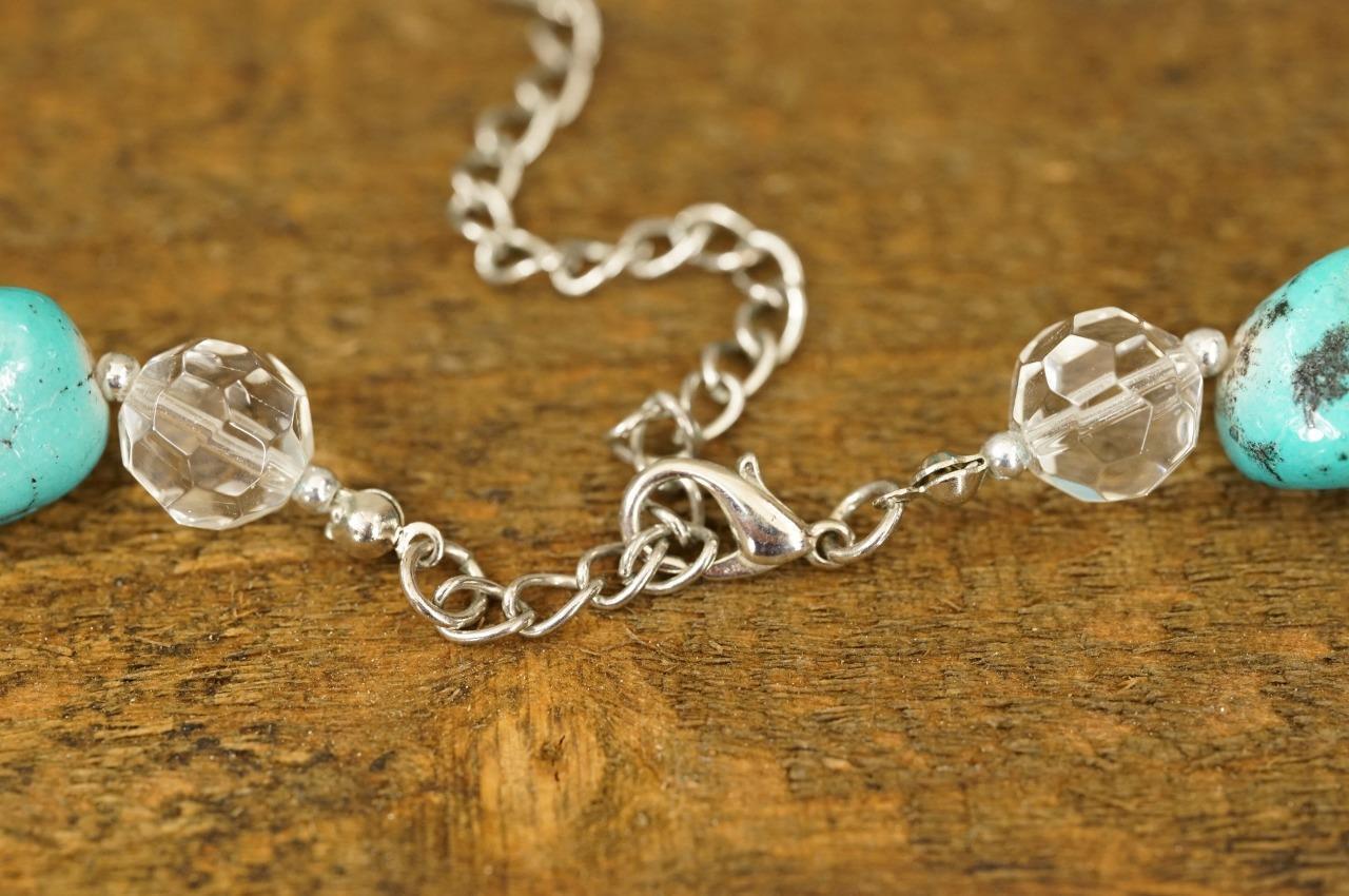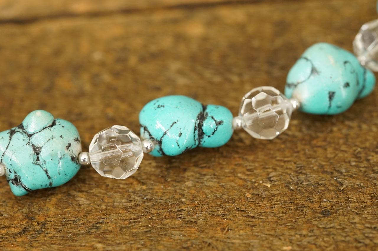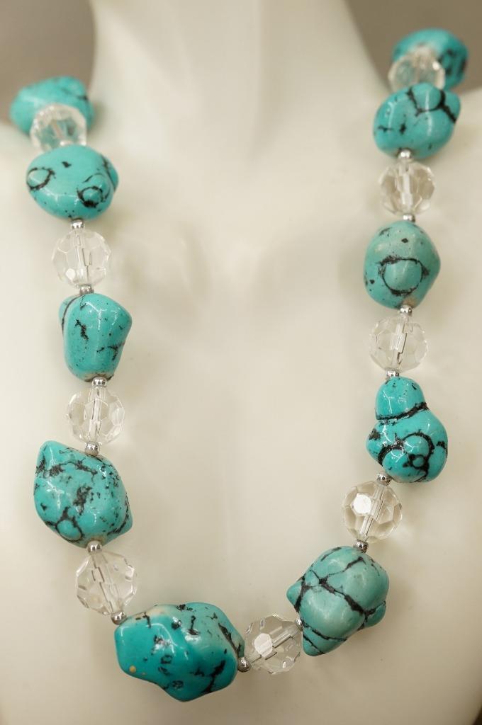 MODERN Artisan Dyed Howlite "Turquoise" Faceted Crystal Chunky Beaded Necklace. Silver tone base metal. Measures 19" long with a 4" extender chain. The chunks of dyed howlite resemble turquoise with the black veining and they are 3/4-1" long nuggets.