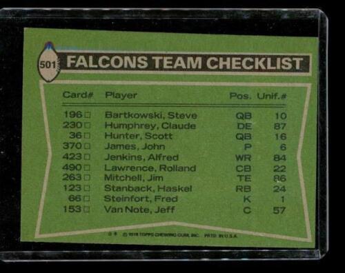 Vintage 1978 TOPPS TCG Football Trading Card #501 TEAM CHECKLIST Atlanta Falcons HASKEL STANBACK, ALFRED JENKINS, CLAUDE HUMPHREY, JEFF MERROW, ROLLAND LAWRENCE