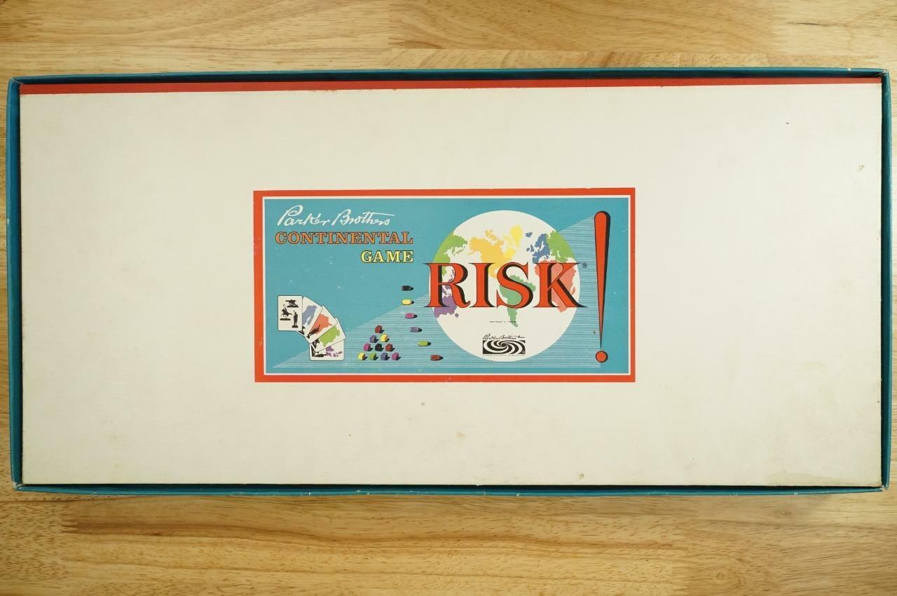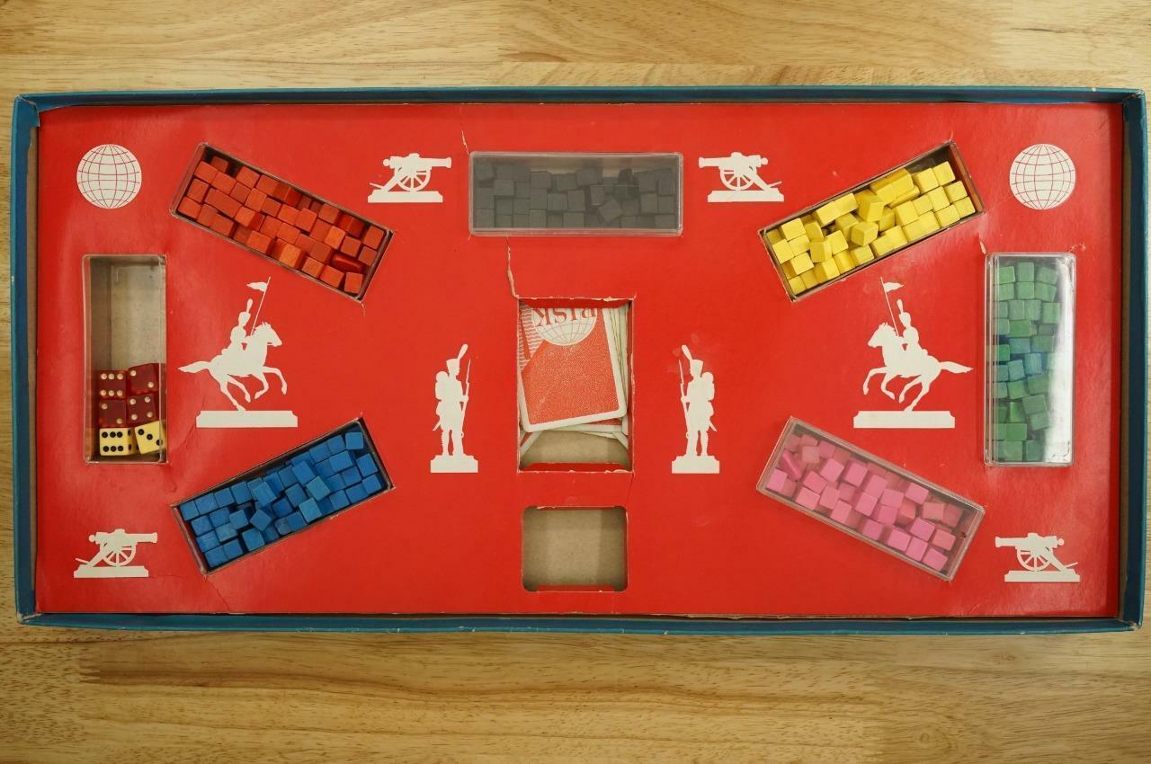 Vintage Military Campaign Parker Brothers 1968 Continental Board Game RISK - several of the clear boxes are missing lids. Wood parts. Original dice. Card and instructions and original board are present. Missing the multi color oblong wood pieces.