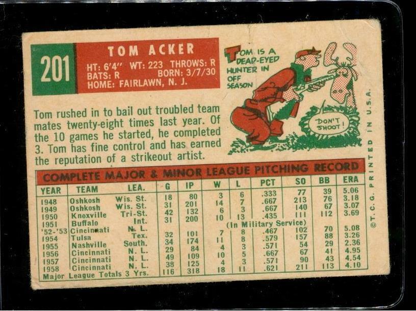 Vintage BASEBALL Trading Card TOPPS 1959 #201 TOM ACKER Cincinnati Redlegs WB