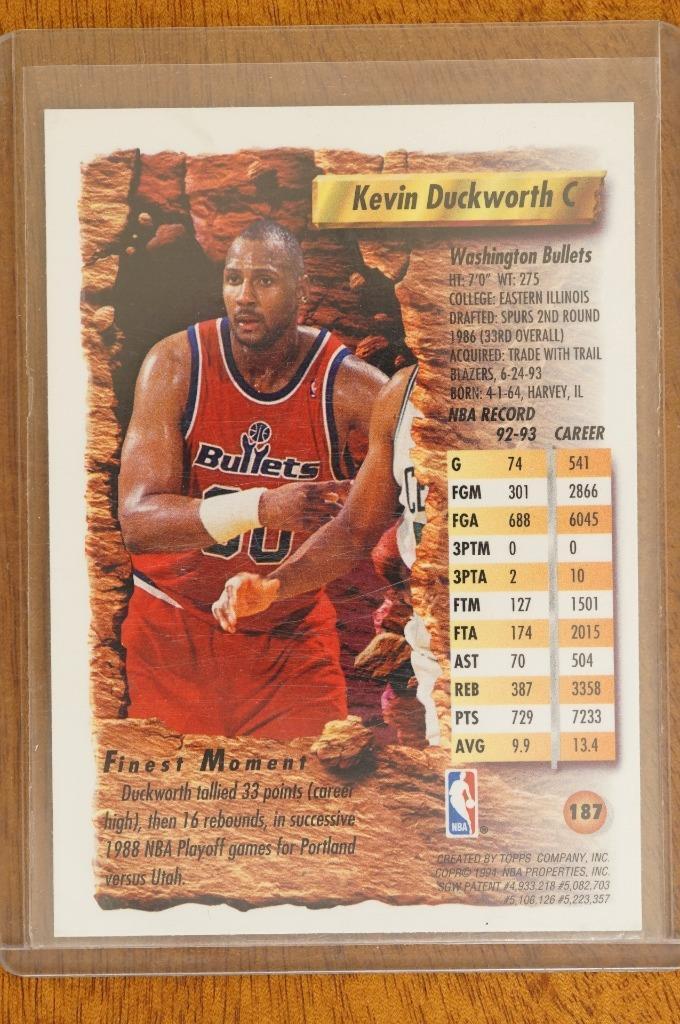 1993-94 Topps Finest Basketball Card #187 Kevin Duckworth Washington Bullets