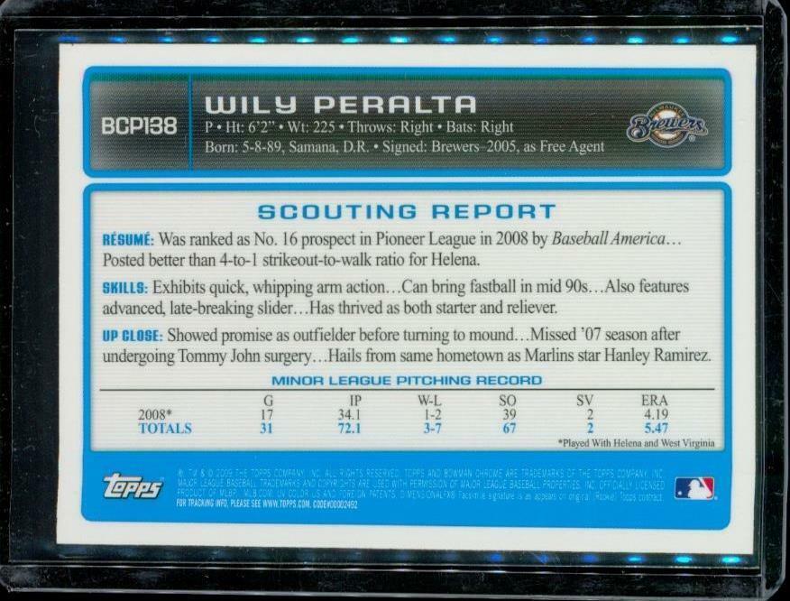 2009 Baseball Trading Card TOPPS Bowman Chrome Prospects BCP138 WILY PERALTA Milwaukee Brewers - Pitcher