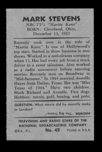 Vintage Bowman TV & Radio NBC Trading Card 1953 MARK STEVENS #42 Martin Kane
