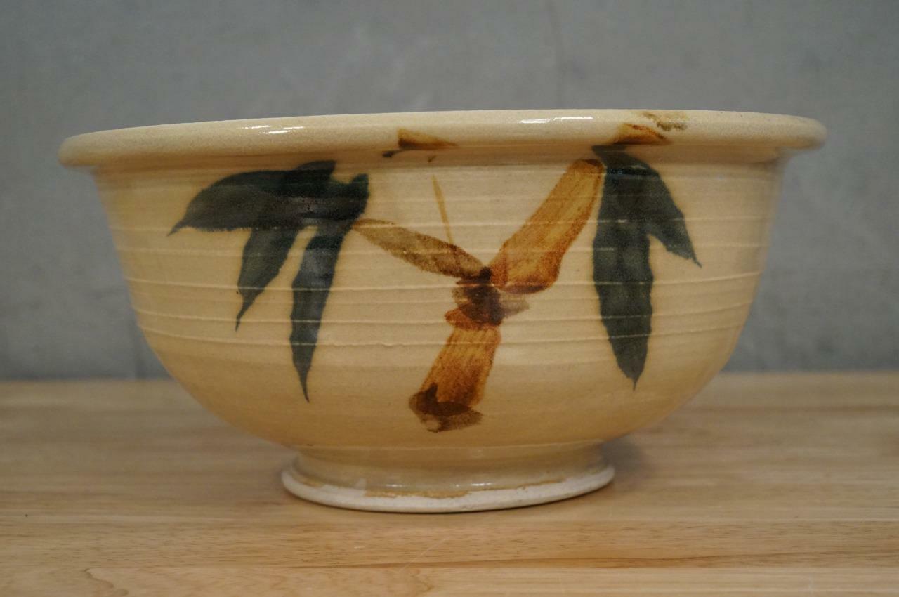 Studio Art Pottery MILES Landis Mixing Serving Bowl Tiki Bamboo Asian Pattern - measures 10" in diameter by 5" tall on a footed base. Signed on the base. Bamboo hand painted design. Lead free.