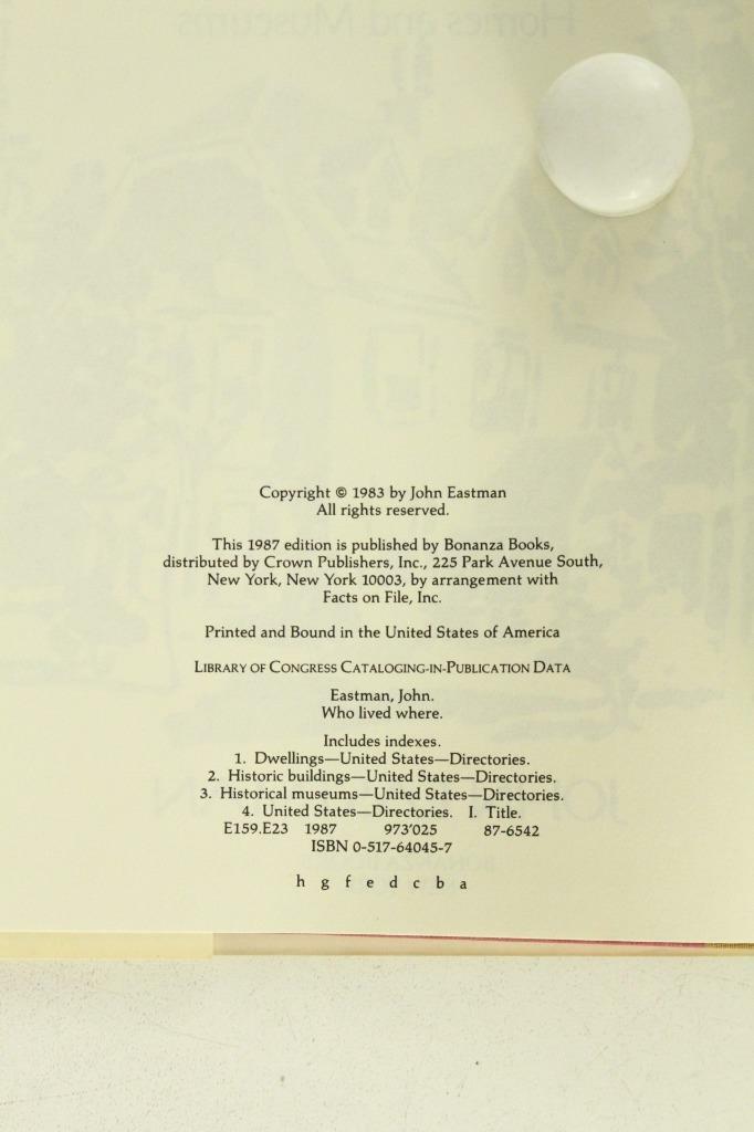 HB Book WHO LIVED WHERE Biographical Guide to Homes Museums John Eastman. Original Dust jacket present. Clean and tight. No smoke or pet odor.