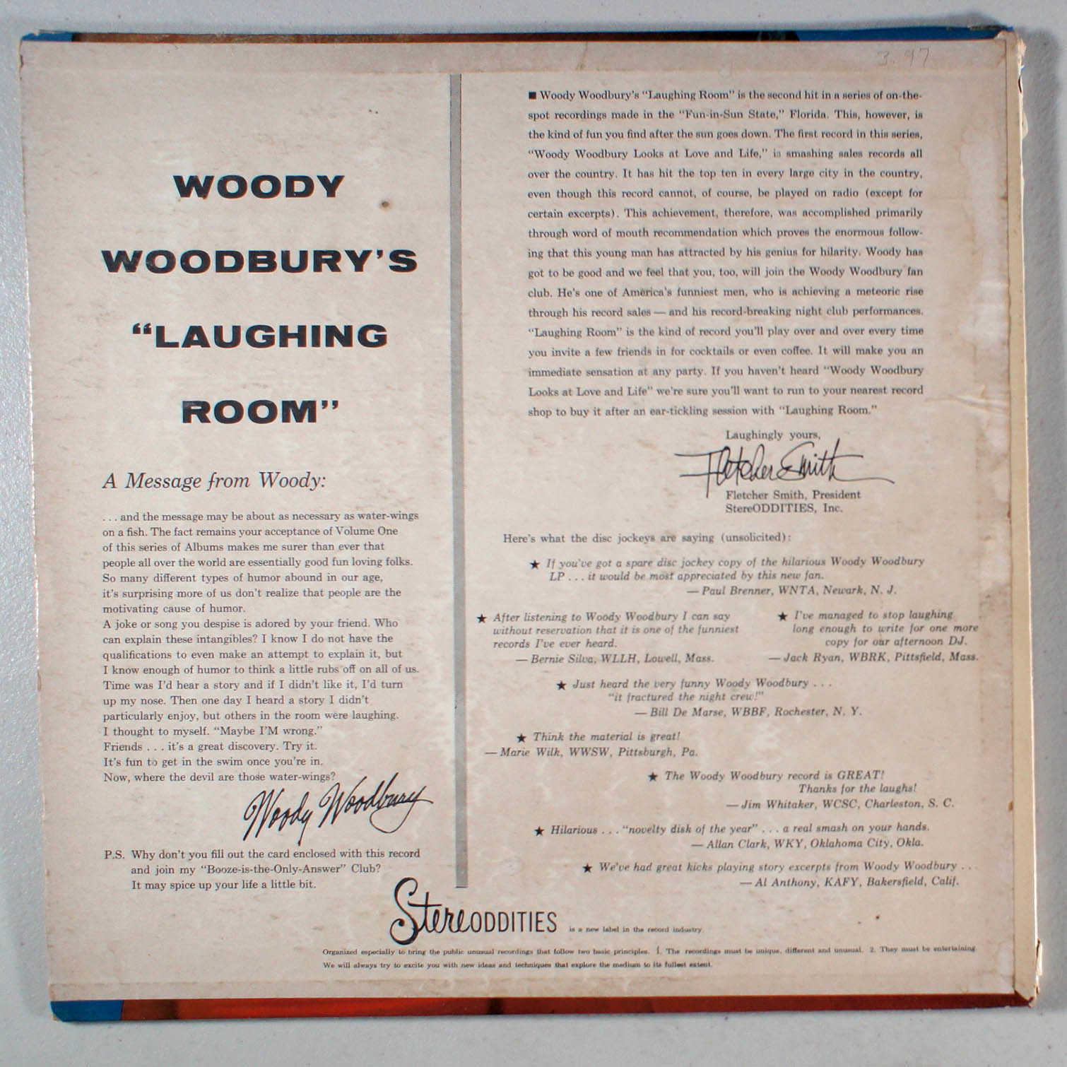 Laughing Room, by Woody Woodbury, was the second hit in a series of on-the-spot recordings made in the state of Florida. The liner notes declare, this "is the kind of record you'll play over and over every time you invite a few friends in for cocktails or even coffee. It will make you an immediate sensation at any party." Robert Dennis Woodbury is an American comedian, actor, television personality and talk show host. He is known for his best-selling comedy albums of risque stories, most of which were released in the early 1960s. He was among the first standup comedians to receive a gold record.