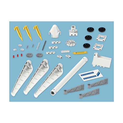 With this kit, you can assemble a realistic wind turbine complete with electric generator and adjustable rotor blades that are designed with complex aerodynamic curves to look and work like modern-day wind turbine blades. Then, conduct experiments to optimise the turbine's performance by adjusting the angle of the blades and discover how to use the wind turbine to light up an LED and charge a rechargeable battery. Convert the generator into an electric motor and assemble a small electric car to demonstrate a tangible application for the stored electricity.