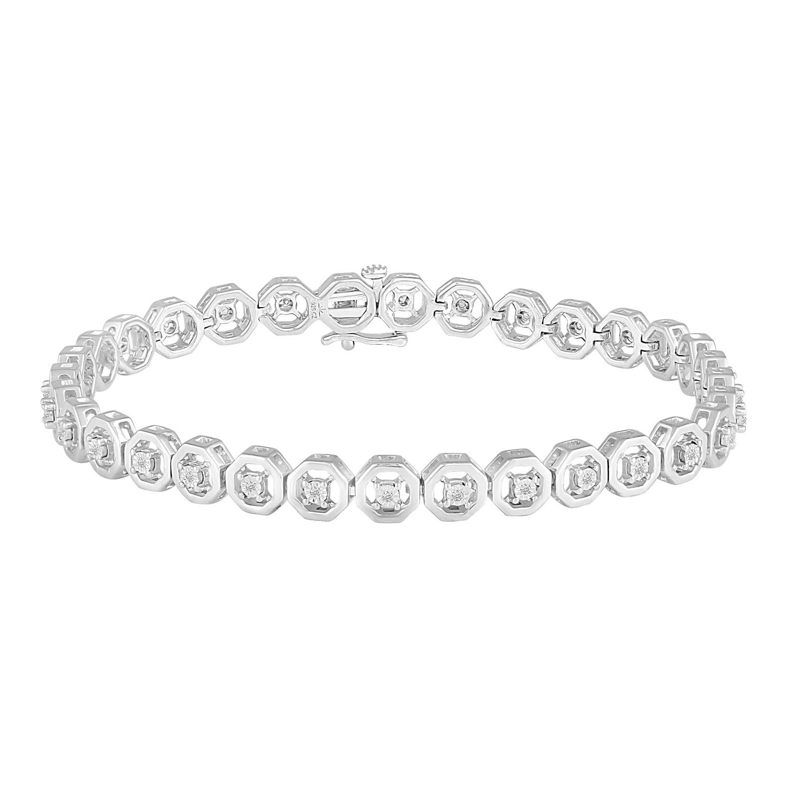 Showcasing a shimmering collection of round diamonds weighing 0.10ct tw in Miracle plates, this 7 inches long Sterling Silver bracelet is a dazzling gift to your loved one.