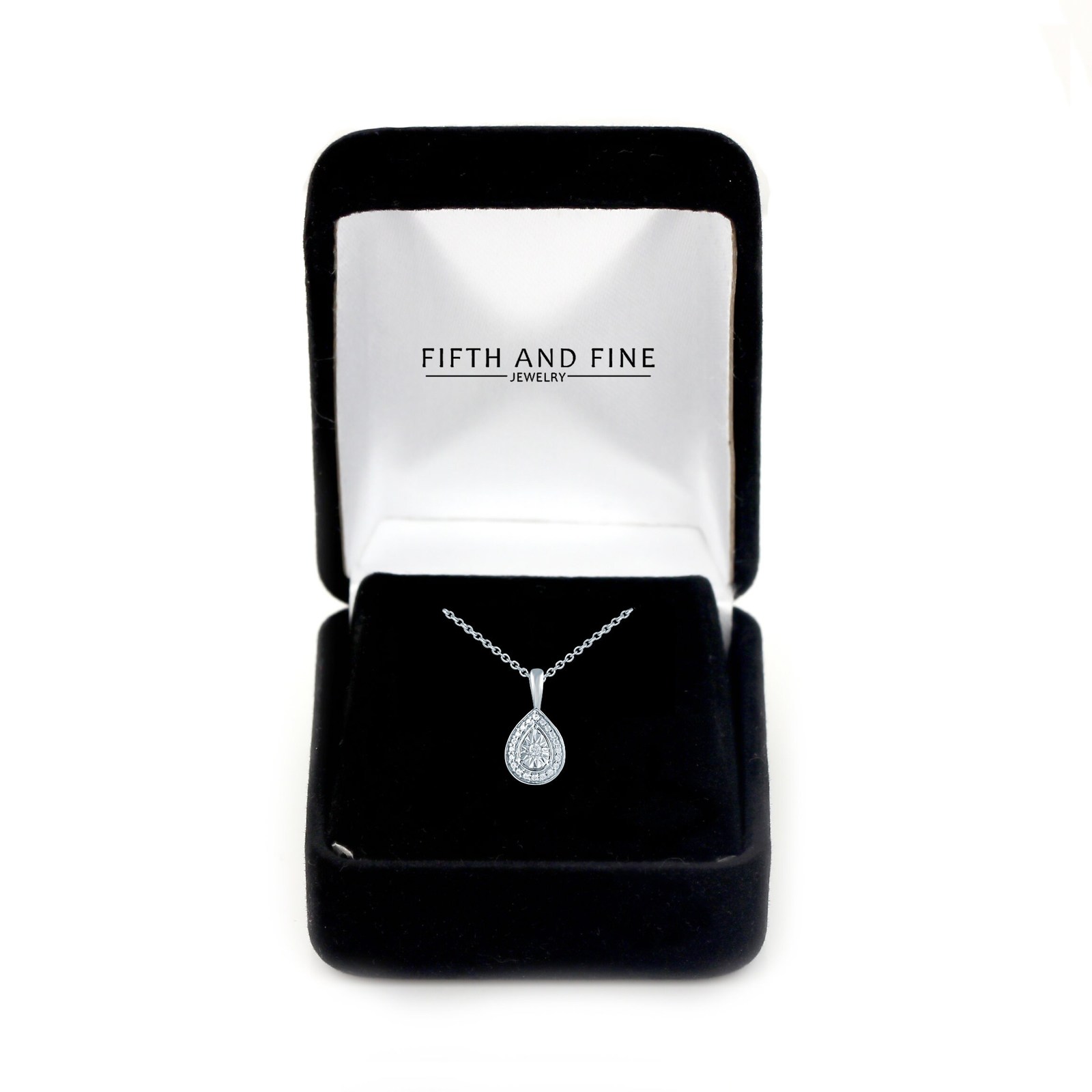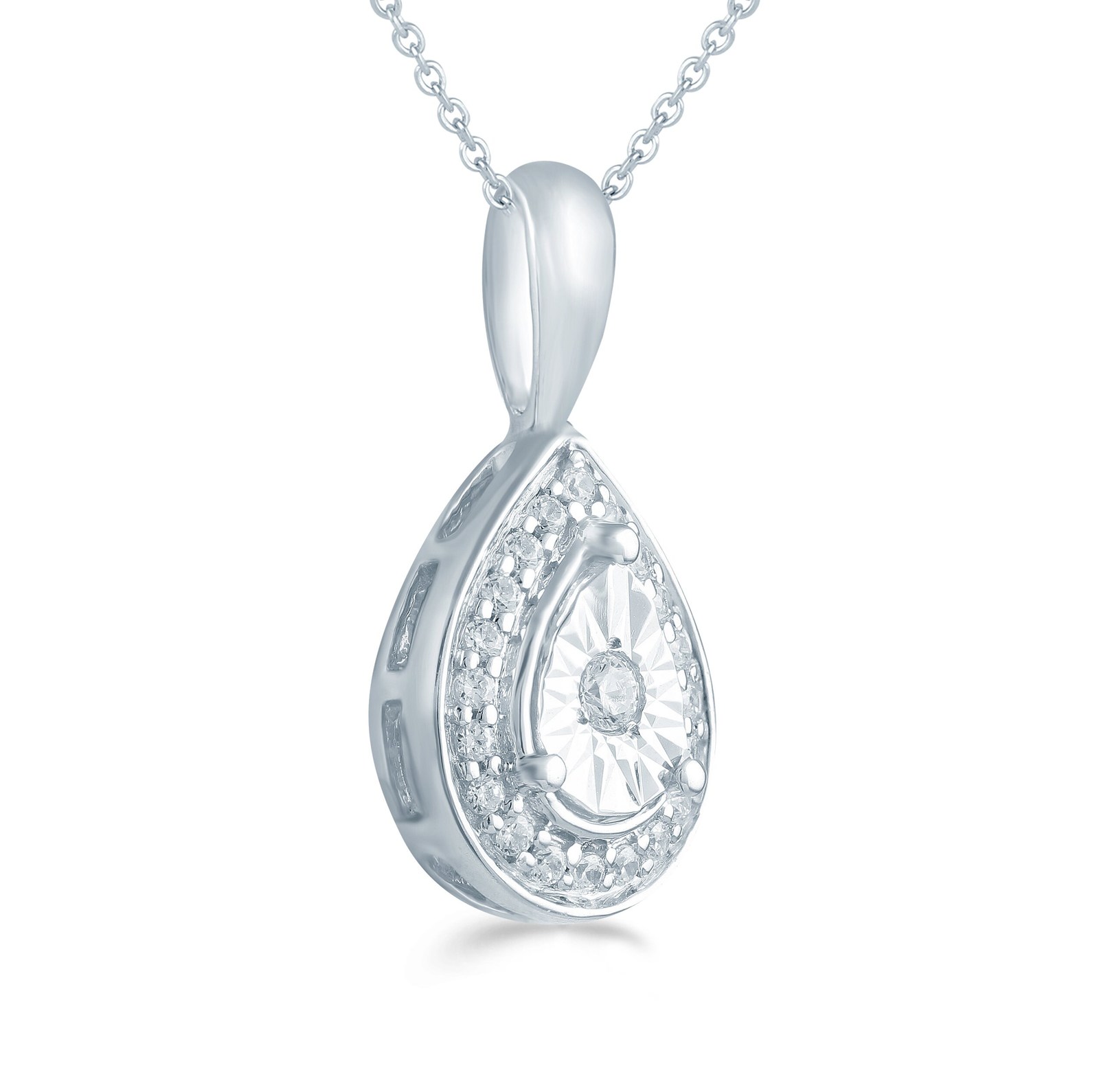 Sterling Silver Pear Shaped Pendant. Brilliantly Set with a Solitaire and Surrounding Halo of 1/10CT.TW. of Diamonds. It comes with 18" sterling silver Cable chain with a lobster lock.