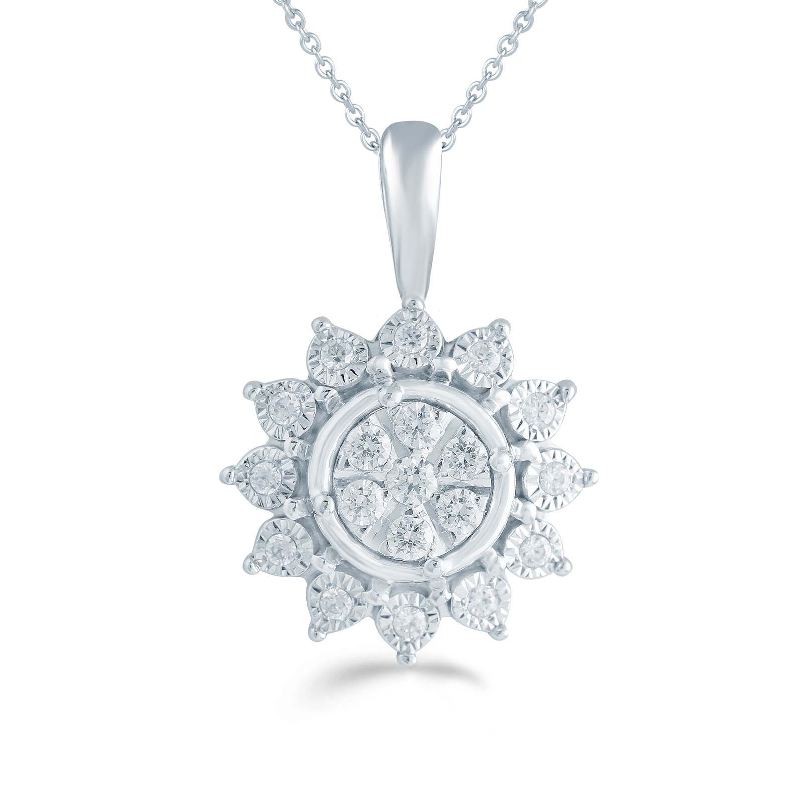 A Delicate Sterling Silver Floral Design. Outlines a Beautiful Layering of Diamonds. It comes with 18" sterling silver cable chain with a lobster lock.