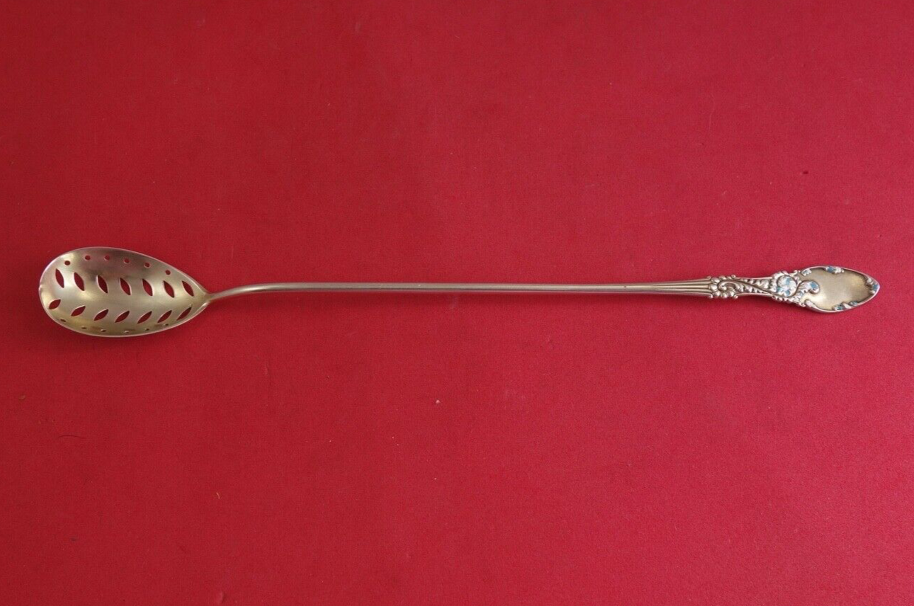 Sterling silver light vermeil Long Olive Spoon, original w/ light blue enamel, 9" in the pattern Tyrolean By Frank Whiting. It is not monogrammed and is in good vintage condition.