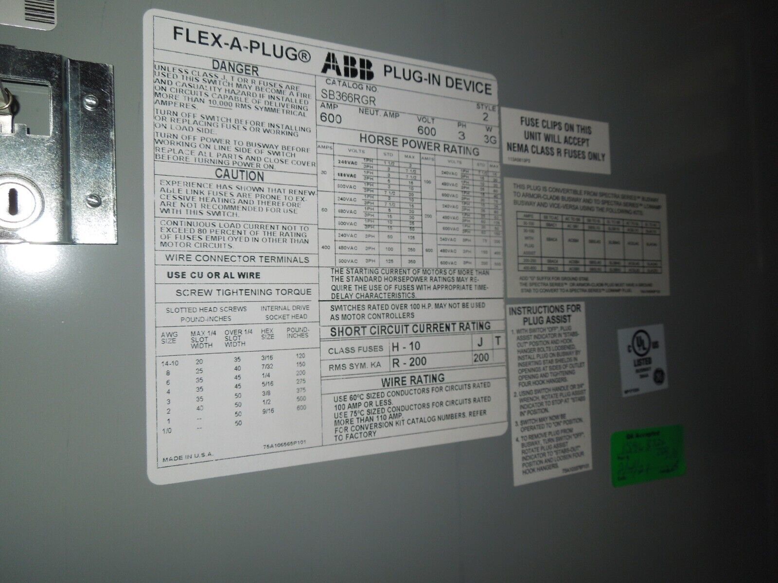 GE Spectra SB366RGR 600A 3ph 3W 600V w/ Ground Fusible Busplug New Surplus