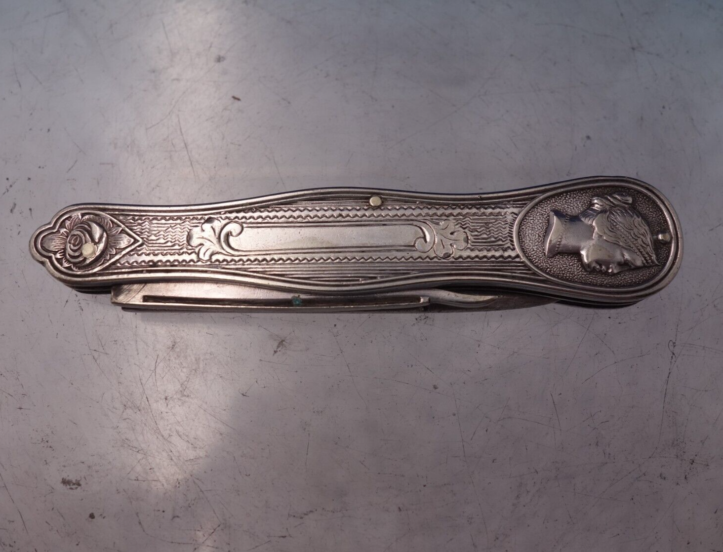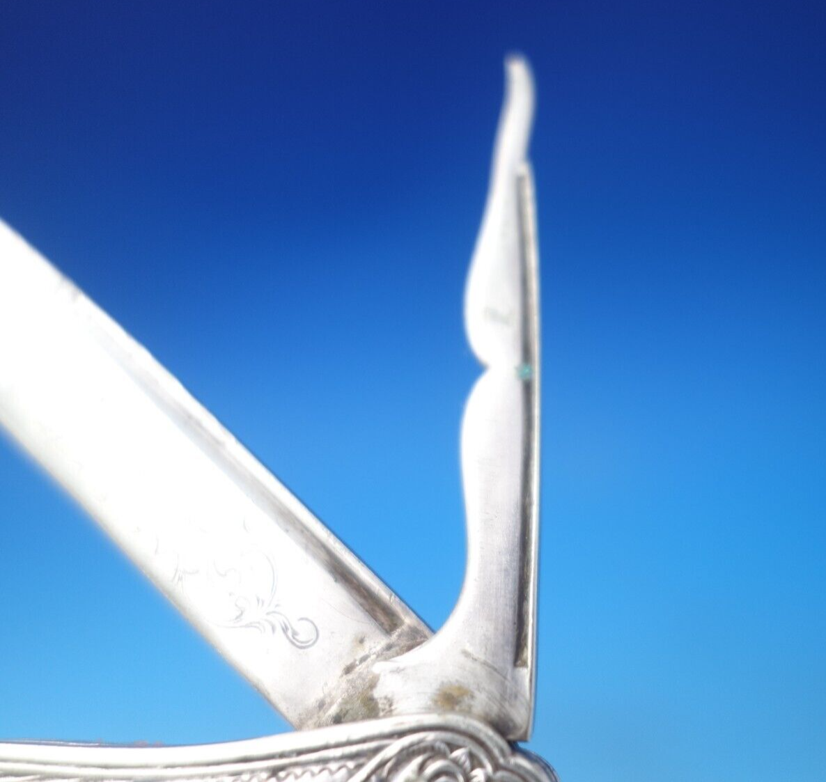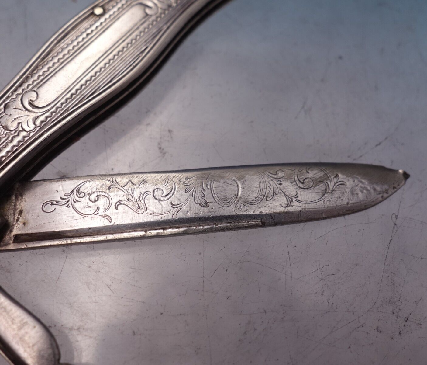 Wonderful Medallion sterling silver pocket knife featuring bright-cut blade with nut pick and fruit knife (maker unknown). This piece is circa 1875 and measures 3 1/2". It is not monogrammed and is in good estate condition as shown in the photos. Terrific!