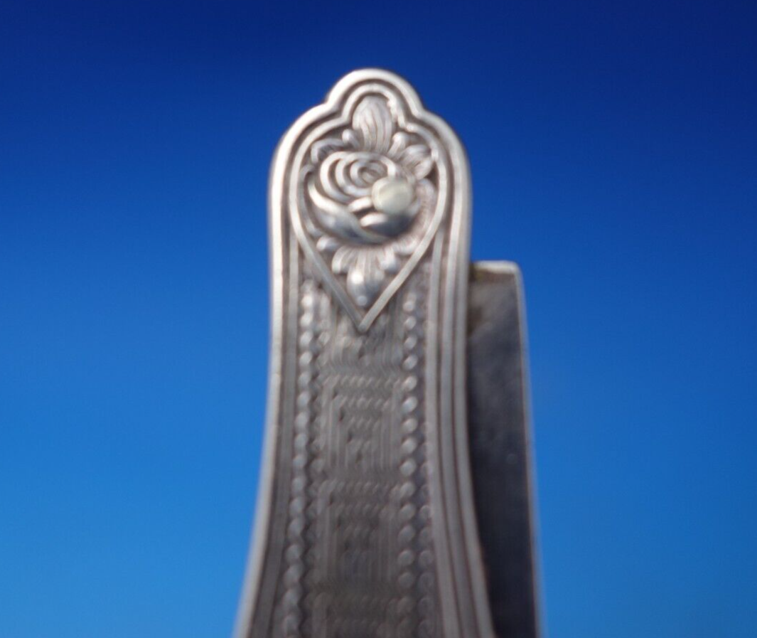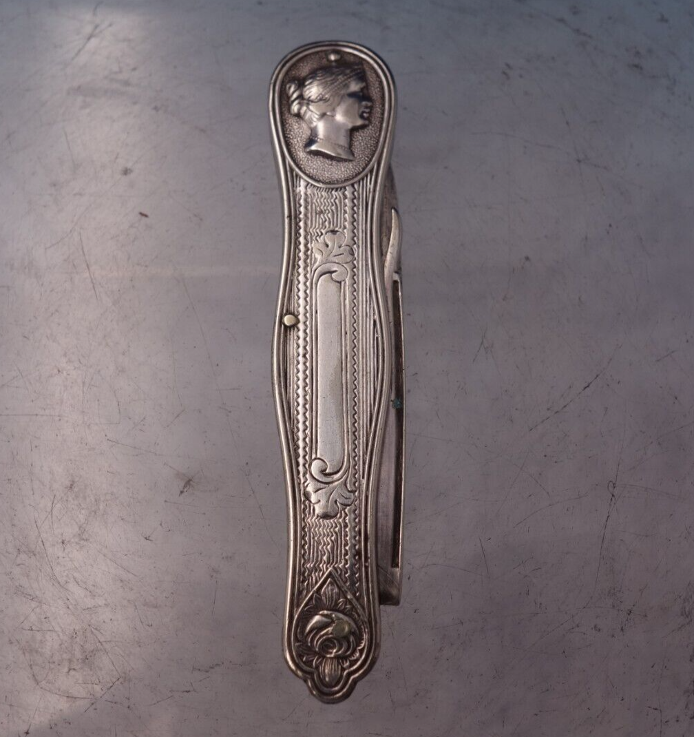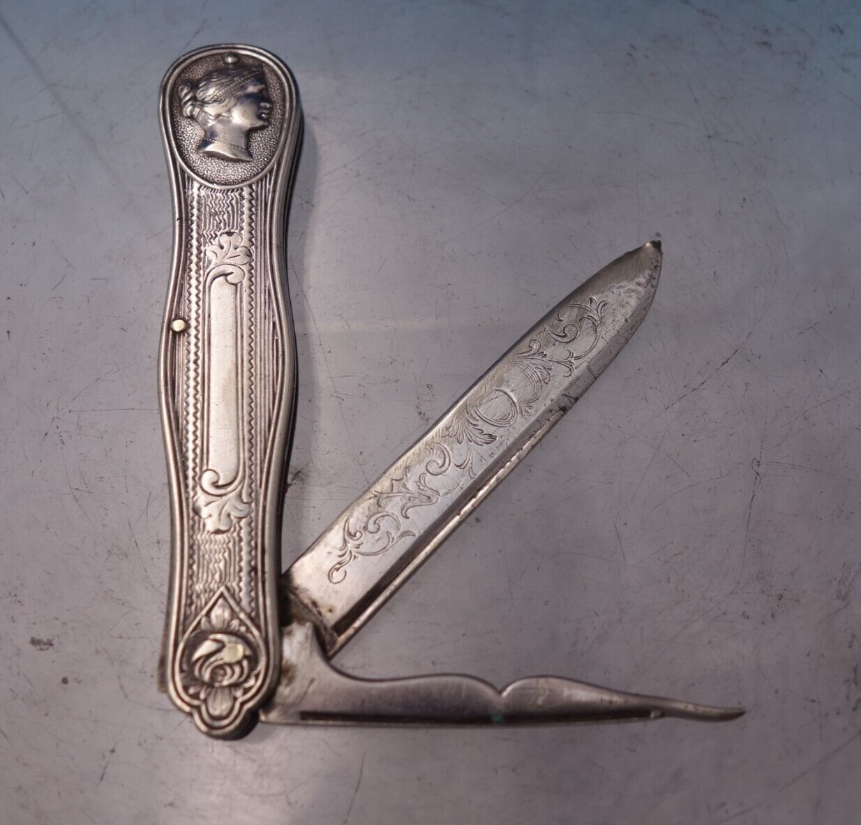 Wonderful Medallion sterling silver pocket knife featuring bright-cut blade with nut pick and fruit knife (maker unknown). This piece is circa 1875 and measures 3 1/2". It is not monogrammed and is in good estate condition as shown in the photos. Terrific!