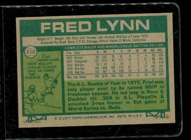 Vintage 1977 TOPPS ALL STARS Baseball Trading Card #210 FRED LYNN Boston Red Sox