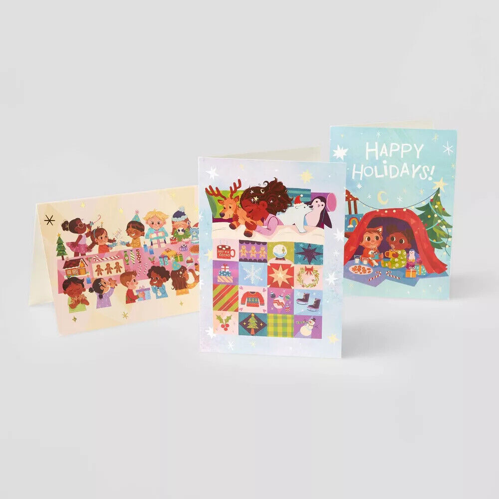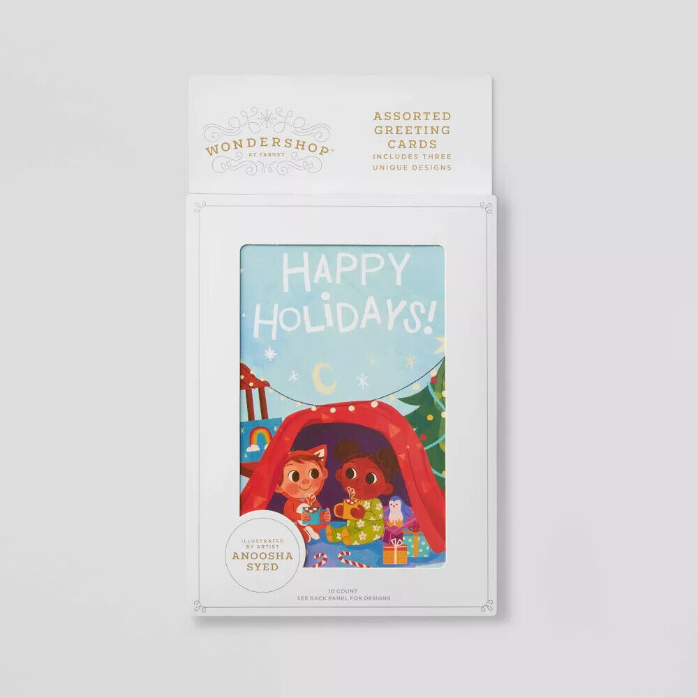 You'll bring smiles to the faces of everyone who receives one of these stunning 10-Count Anoosha Syed Assorted Holiday Greeting Cards from Wondershop?. These beautiful holiday cards illustrated by artist Anoosha Syed feature hand-drawn prints of three scenes that view favorite Christmas traditions through the eyes of children ? children enjoying a holiday party with foods, gifts and traditions from around the world, a young Pakistani girl dreaming of the holidays under a patchwork quilt of holiday treats, and youngsters under a blanket fort waiting for Santa ? all focusing on the gathering of family and friends for the holiday. You'll receive 10 colorful greeting cards and envelopes to send to your own family and friends this holiday season.