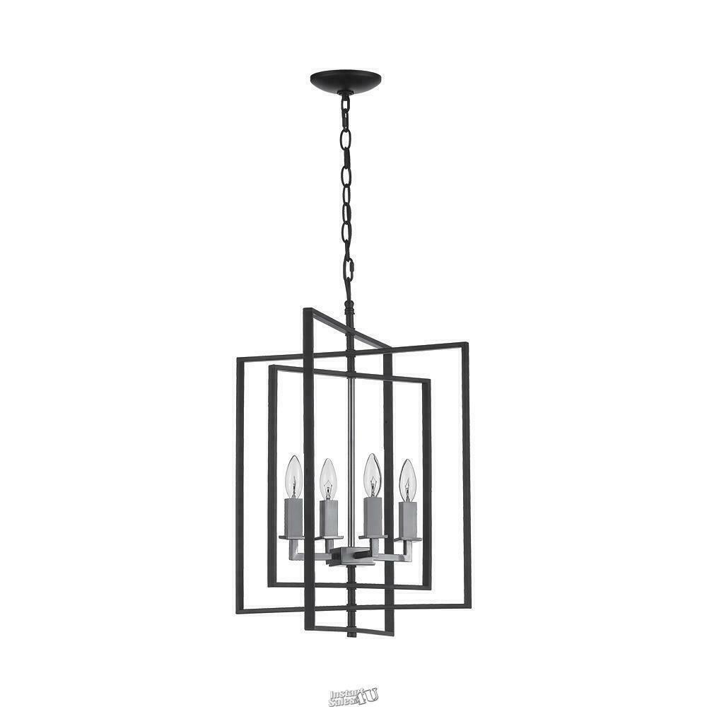 This 4 light caged chandelier has a modern two color finish with black and brushed nickel details. The straight lines are sleek and give a fresh update to a classic chandelier style. The adjustable height makes it easy to place in dining areas or entryways. This piece will add light and style to your home, Also available in matching 6 light version for more options. Comes in two tone black and brushed nickel finish Adjustable hanging height Uses (4) candelabra base bulbs, not included ETL safety listed, for indoor use only Also available in 6 light option Installation instructions included Includes mounting kit with matching canopy and chain Dimensions Canopy Height (in.) 1 Canopy Width (in.) 5 Chain Length (In.) 60 Fixture Depth (In.) 17 Fixture Height (In.) 24.5 Fixture Width (In.) 20 Maximum Fixture Hanging Length (In.) 85.5 Maximum Hanging Length (in.) 85.5 Details Chandelier/Pendant Design Candlestick,Geometric Compatible Bulb Type Incandescent ConnectionType Hardwired Damp/Wet Rating Dry Rated Features Adjustable Hanging Length Fixture Color/Finish Black and Brushed Nickel Fixture Color/Finish Family Black Fixture Material Metal Hanging Device Chain Included Mounting Hardware Included Light Bulb Base Code E12 Light Bulb Type Included No Bulbs Included Light Direction Ambient Maximum Bulb Wattage 40 W Maximum Wattage (watts) 0 Number of Lights 4 Lights Number of Tiers Single Tier Product Weight (lb.) 5 lb Recommended Light Bulb Shape Code E12 Returnable 90-Day Shape Candle-Style,Rectangle Style Transitional