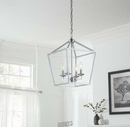 The Weyburn Collection exhibits farmhouse style indoor lighting with rustic, industrial appeal. Enhance your entryway, kitchen, or dining room with the classic styling of this four-light chandelier. Highlighted by a contemporary metal birdcage design and polished chrome finish, this fixture adds a warm glow to a variety of indoor spaces. The open caged shade exposes the candelabra style bulbs for a classic look, perfect for providing ample task lighting. This adjustable chandelier is mounted with a matching ceiling canopy and includes 5 feet of chain for a customizable suspension height. Shop the Weyburn Collection for additional finish options and light counts. Farmhouse chandelier with sleek polished chrome finish Includes 60 in. chain for adjustable hanging height from 20 in. up to 79 in. Round ceiling plate measures 5 in. diameter Uses (4) 60-watt candelabra base bulbs, not included LED light bulb compatible, use 60-watt equivalent Bulbs can be accessed through the open cage metal shade Fixture contains no glass Dimmable when used with compatible light bulbs/dimmer switch combination Can be mounted on sloped ceilings Assembly instructions and hardware included Suitable for use in dry, indoor locations Shop the Weyburn Collection for additional finishes and sizes Dimensions Chain Length (In.) 60 Fixture Depth (In.) 12 Fixture Height (In.) 18.5 Fixture Width (In.) 12 Maximum Fixture Hanging Length (In.) 79 Maximum Hanging Length (in.) 79 Mounting Deck Height (in.) 1 Mounting Deck Width (in.) 5 Details Chandelier/Pendant Design Candlestick,Geometric Compatible Bulb Type Incandescent,LED ConnectionType Hardwired Damp/Wet Rating Dry Rated Features Adjustable Hanging Length,Dimmable,Indoor,Sloped Ceiling Adaptable Fixture Color/Finish Polished Chrome Fixture Color/Finish Family Chrome Fixture Material Metal Hanging Device Chain Included Adjustable Height,Hardware Included,Mounting Hardware Included Light Bulb Base Code E12 Light Bulb Type Included No Bulbs Included Light Direction Ambient Maximum Bulb Wattage 60 W Maximum Wattage (watts) 0 Number of Lights 4 Light Number of Tiers No Tier Product Weight (lb.) 4.4 lb Recommended Light Bulb Shape Code B10 Returnable 90-Day Shape Cage,Cluster,Lantern,Square Style Industrial Warranty / Certifications