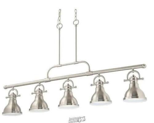 Sturdy, exquisite construction 5-year limited warranty on integrated LED's (included with purchase) Stunning bell-shaped brushed nickel bowls Perfect complement to stainless-steel appliances, kitchens, islands, dining rooms, bars, studies, desks, restaurants and many other indoor areas High-quality, stunning brushed nickel extreme durability and top quality protection against scratches Outer lacquer finish provides attractive sheen and additional protection layer Modern, transitional or contemporary design Go green environmentally friendly, energy-efficient integrated LED's Clean, minimal and solid color design blends in seamlessly with surroundings and existing decor Open/uncovered bell-shaped bowls help prevent dust accumulation 880 Lumens per LED (4400 Lumens total)/3000K color temperature/80 CRI Dimmable (TRIAC/ELV, 10% [120-Volt only]) Suitable for dry locations only Heat-resistant components withstand up to 10-Watt 5-light fixture (integrated LEDs included) Free 3 ft. looped hanging chain (included with purchase) Free 8 ft. electrical wire (included with purchase) This integrated LED indoor brushed nickel linear kitchen Island hanging pendant features bell-shaped bowls. Go green and save big. Energy-efficient LEDs are environmentally friendly and require substantially less electricity to maintain, passing down cost-cutting savings to you. Enjoy this piece's sleek, modern design. Clean, minimal and solid color design blends in seamlessly with surroundings and existing decor. Open/uncovered bell-shaped bowls help prevent dust accumulation. Perfect complement to stainless-steel appliances, kitchens, islands, dining rooms, bars, studies, desks, restaurants and many other indoor areas. Suitable for dry locations only. Beautifully finished with flawless nickel brushed to perfect symmetry by skilled craftsmen. Feel at ease with brushed nickel's lasting quality and stunning appearance. High-quality nickel provides phenomenal durability and an attractive gleam. Hard surface provides top quality protection against scratches. Easy maintenance simply clean and polish to achieve an even more lustrous shine. Outer lacquer finish provides an attractive sheen and additional layer of protection.