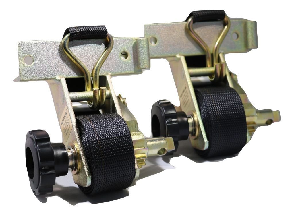 12 Ladder Rack Ratchet Strap Tie Downs Steel Mounting Angle Fits 1" and larger Square Rectangular Tube 1.5" x 8 ft. Made in USA Webbing Strap w/ Double J Wire Hook Yellow (Gold) Zinc Inhibits Rust 500 lb. Working Load Limit for Pro Contractor Duty End is Squared Off Allowing Tightening by Wrench or by Included Rod 4-Way Mounting Hardware is Included, See Photo Webbing Optimized for Weather, UV Abrasion Resistance Lightweight, High Strength Design Made in USA The original Rack-Strap Brand, they invented it and continue to perfect it all in the US Replaceable Parts, Best Warranty in the Industry Will last years with normal use!