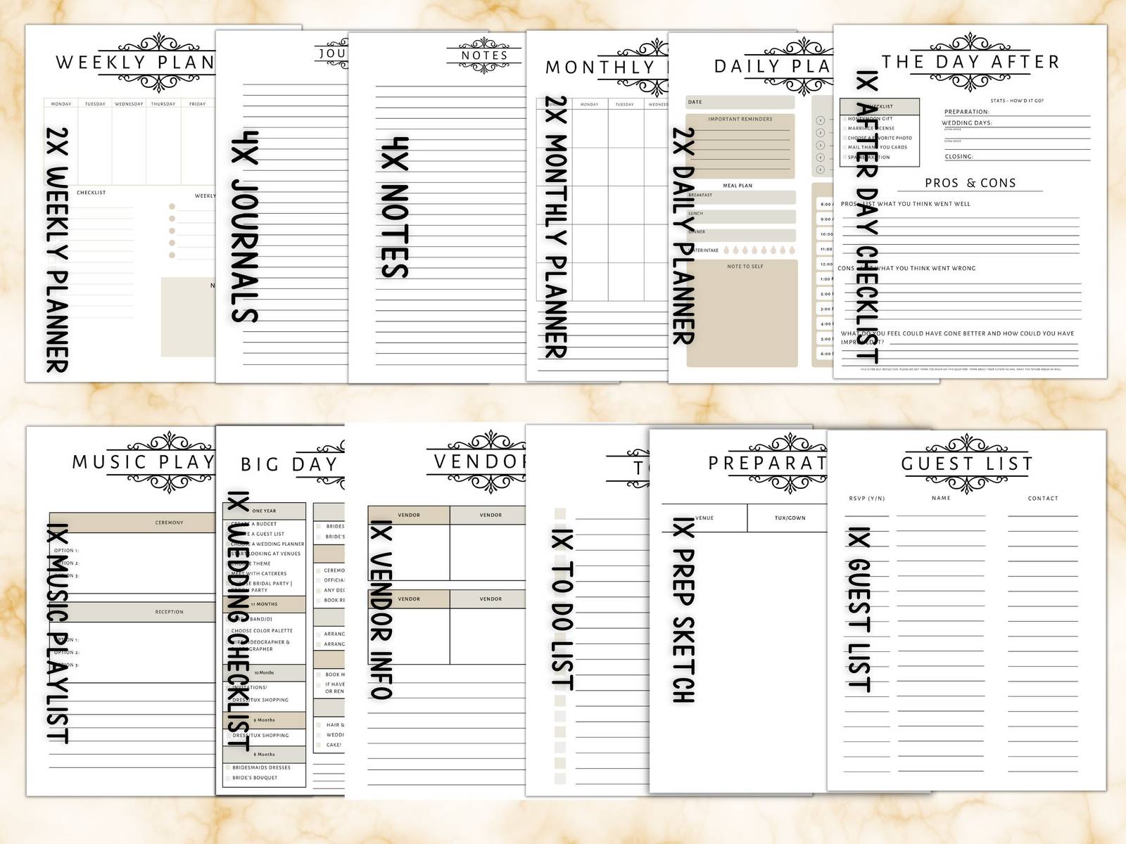 Everything from venue comparison to vendor information is available at your fingertips in a convenient monthly, weekly, daily, and even journaling format.