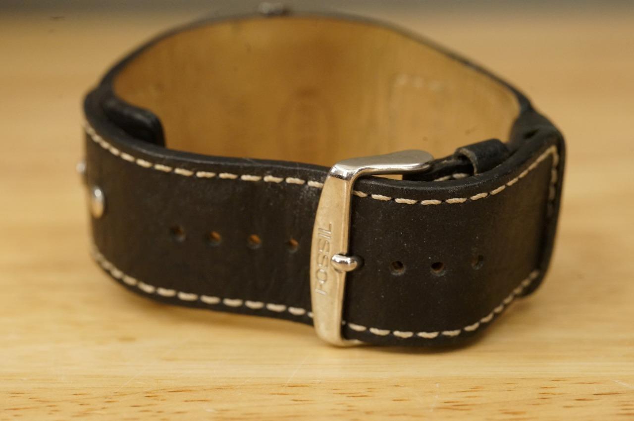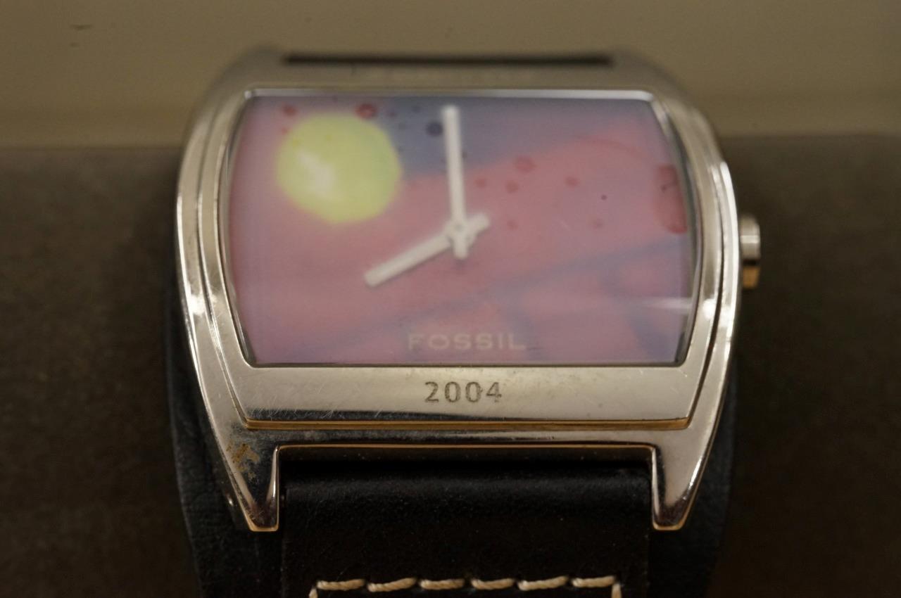 MODERN Jewelry FOSSIL Unisex Quartz Watch Leather Band Abstract Full Moon Art 2004. Needs a new battery. Crystal is foggy, needs removed and cleaned. No smoke or pet odors. Fit up to 8" wrist.