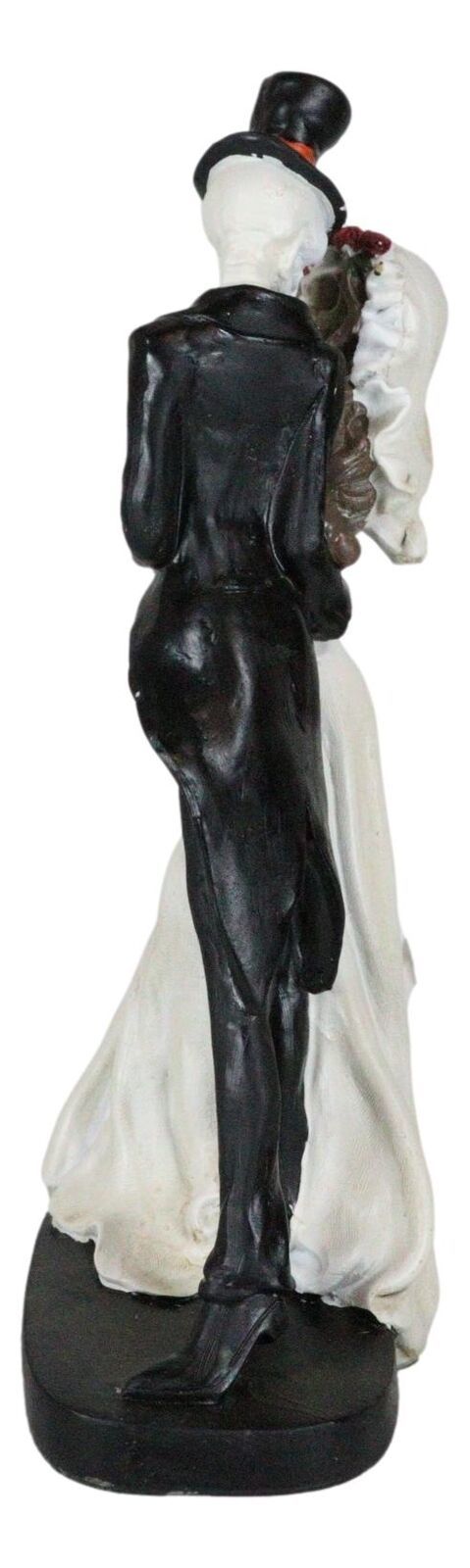 ? This Skeleton Wedding Couple is a perfect wedding anniversary gift as well as an awesome decor for the day of the dead celebration. It features an adoring couple dressed in formal white wedding gown and black tuxedo. The groom presents to his bride a beautiful red roses bouquet.