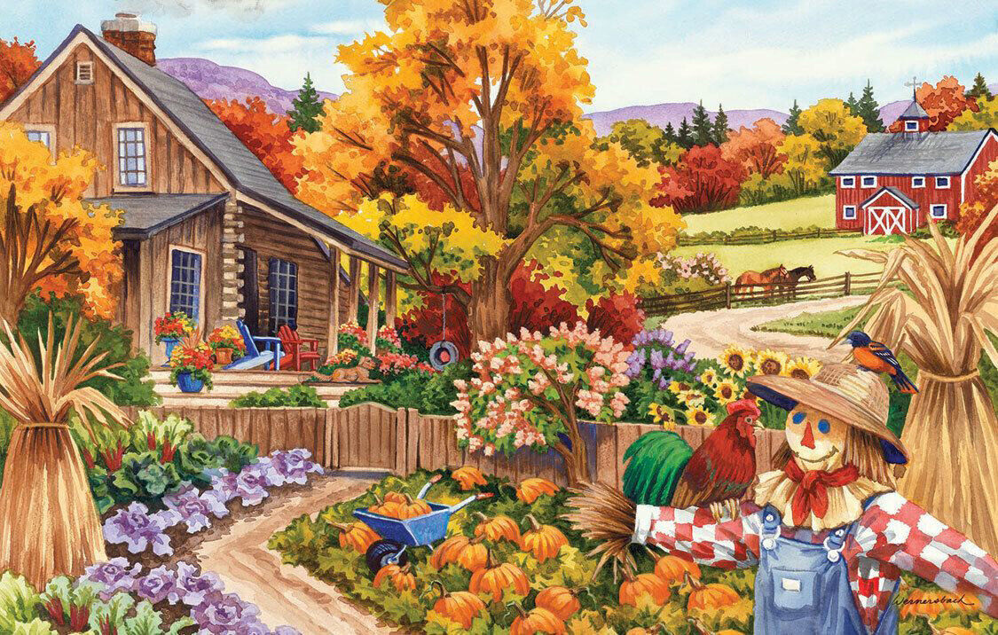 FRAMED CANVAS PRINT art print country living pumpkins, a scarecrow, a rooster