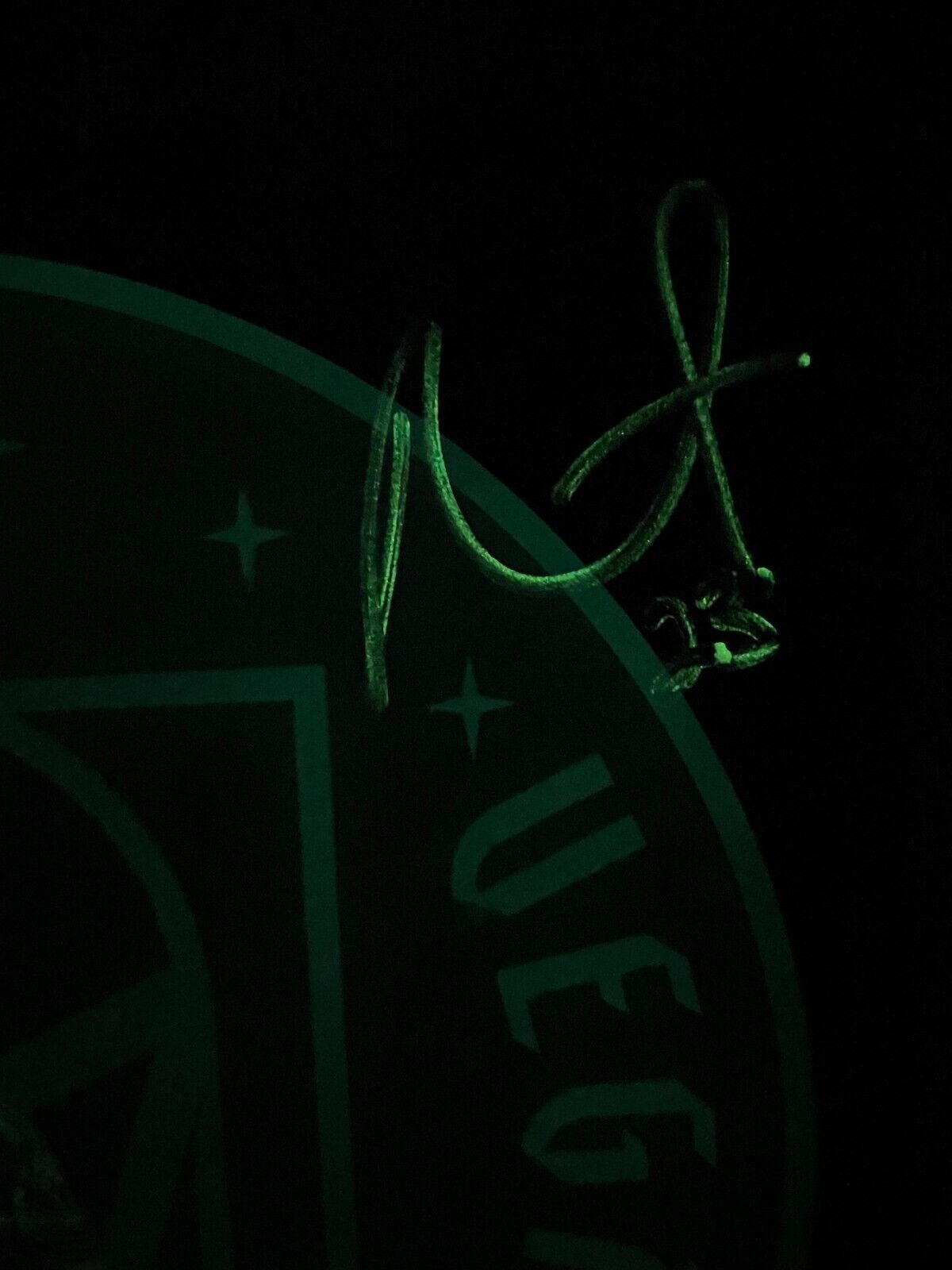 When the autograph is in the light, it displays as a white colored signature, but when the lights turn off, and it has been activated by a source of light, the autograph will GLOW in the dark! To really bring the glow in the dark features out in the signature, it is best if it is activated with a black light, which is what you see in the lights out example photo of this listing.