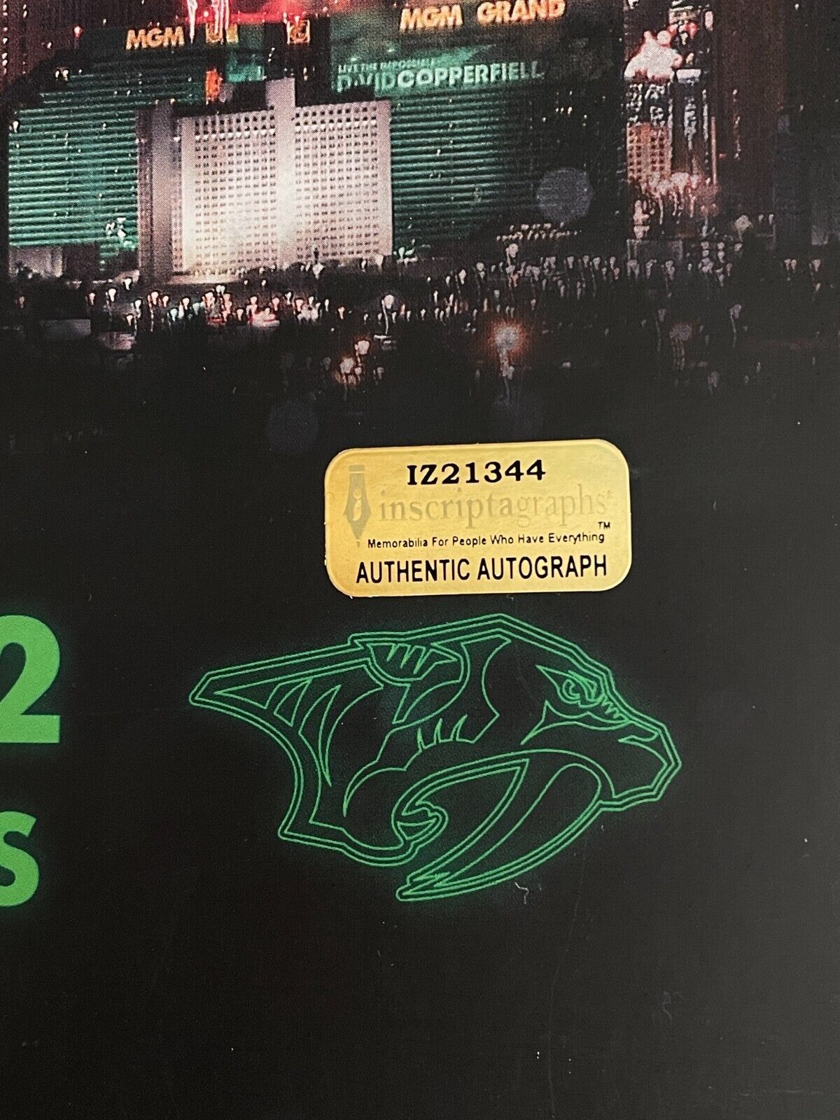 VEGAS FANS!! Check out this "Glow in the Dark" Vegas Golden Knights Reverse Retro 11" x 17" Gameday Poster signed by Vegas Hockey star, Alec Martinez! This poster was handed out by the Knights at the game on December 31, 2022, vs. the Nashville Predators! This product is part of Inscriptagraphs' exclusive "Glow in the Dark" Retro Autographed Memorabilia Collection inspired by the very first jersey to GLOW in the NHL! The poster itself actually glows in the dark, 1 of only 2 posters handed out by the Knights for all of their reverse retro themed games that actually glow and not simulated by graphics like their other 6 posters from other retro games. Alec hand signed this poster towards the top right corner of the poster. When the autograph is in the light, it displays as a white colored signature, but when the lights turn off, and it has been activated by a source of light, the autograph will GLOW in the dark! To really bring the glow in the dark features out in the signature, it is best if it is activated with a black light, which is what you see in the lights out example photo of this listing. This item is authenticated by Inscriptagraphs Memorabilia and was signed by Alec on January 18, 2023, at our private signing with him in Las Vegas. The actual Certificate of Authenticity is available on the Inscriptagraphs hologram database website that is indicated on the gold tamper-proof hologram on the item. This item will also include the paper certificate of authenticity card. You will enter the code number on the hologram of this item into our database and up will pop the certificate of authenticity for this item, forever. You can print out that document as proof of the authenticity of this collectible. Inscriptagraphs is proud to only authenticate items that are witnessed autographs amp; in the presence of a company representative. Will we authenticate 3rd party items based on an "opinion". Never do you have to worry about the authenticity of our collectibles as we pride ourselves in our secure state of the art, industry-leading authentication system. Note: This is a stock item where we are showing you a generic image of the item mentioned, although it may or may not be the exact one you will receive. The autograph amp; glow in the dark quality may vary from the photo pictured, as well as the location of the autographs. As a general statement, the poster condition you will receive is in very good shape with no tears whatsoever, but may have slight wrinkles or edges may have slight imperfections.