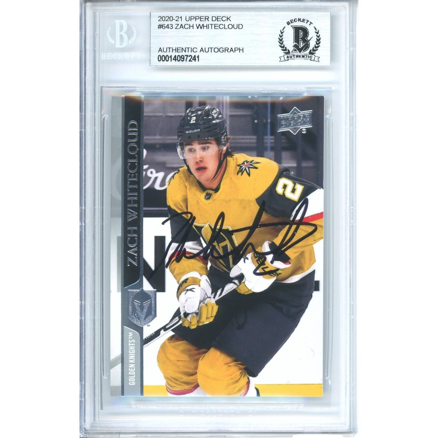 Vegas fans, this item is your calling! Check out this 2020-2021 Upper Deck Zach Whitecloud Autographed #643 Trading Card! This card has been encapsulated by Beckett for long-term preservation of the card, as well as authenticated by them as being an authentic signature. Beckett as you may already know, is one of the largest and must reputable autograph authentication companies in the industry today! This is a must-have item for your man cave, game room lady lair or office!