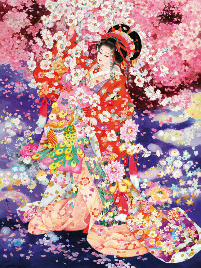 Geisha Japanese girl flower garden ceramic tile mural backsplash medallion