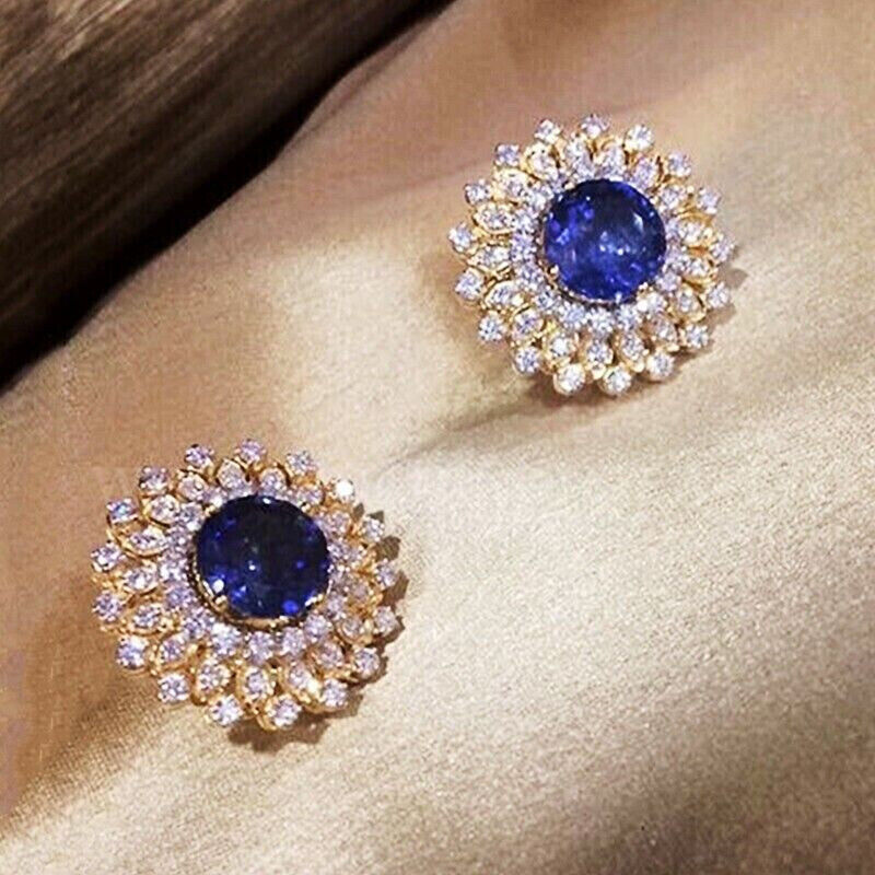 3Ct Round Cut CZ Blue Sapphire Women Halo Stud Earrings 14K Yellow Gold Plated