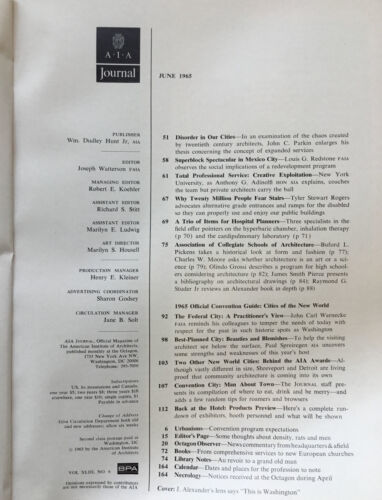 AIA Journal June 1965. Monthly publication of the American Institute of Architects. Ex-library in good condition. See pictures for table of contents. Feel free to email with questions. I do combine shipping on multiple purchases. Have a great day!