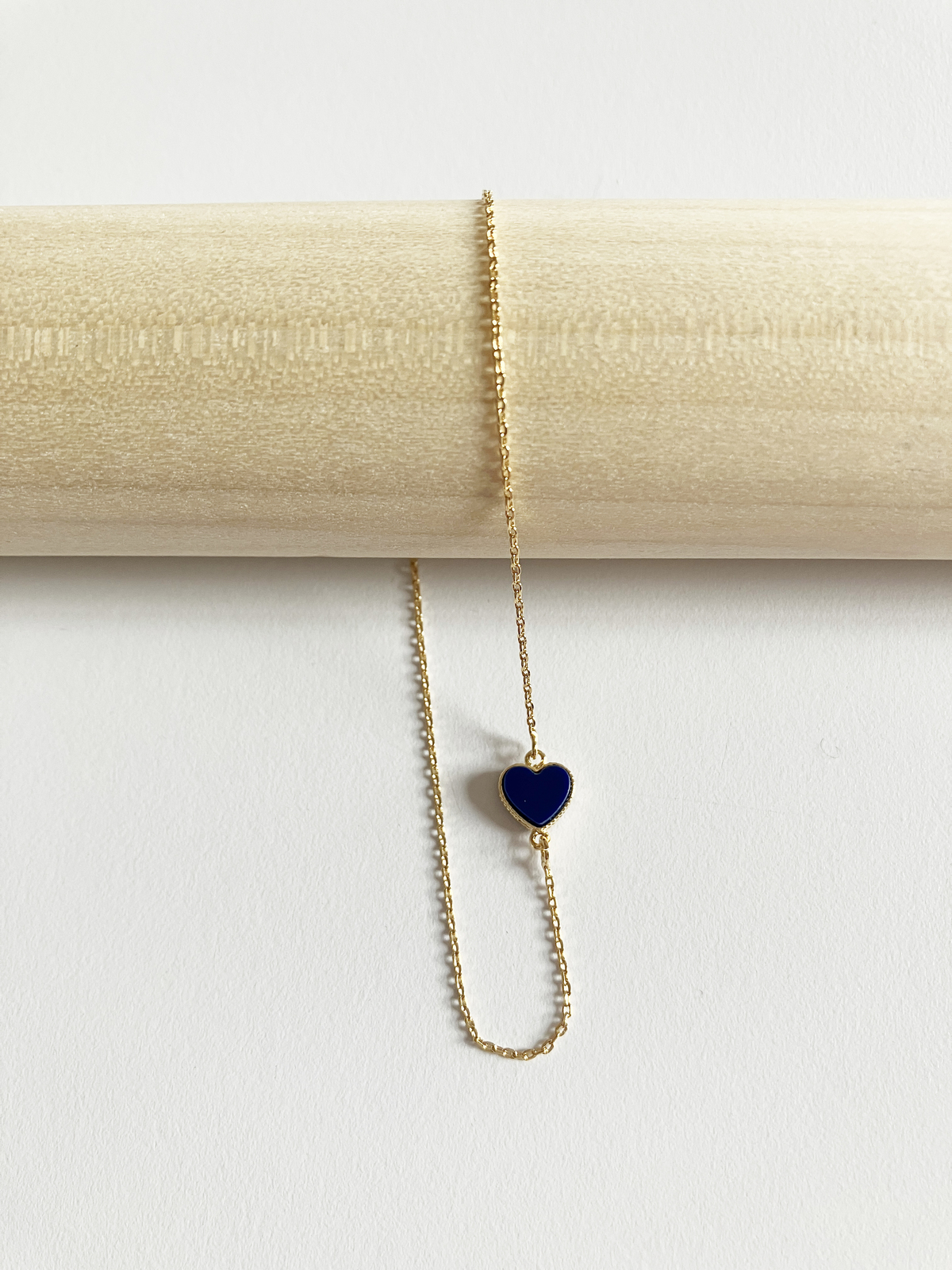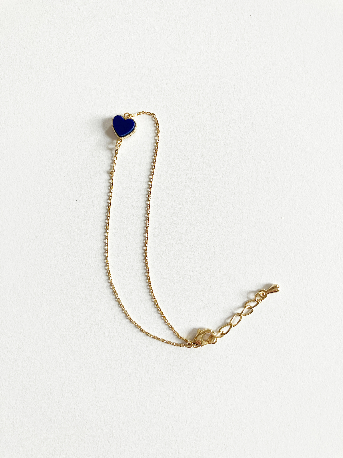Adorable heart motif bracelet with lapis lazuli stone set in gold plated non-tarnishing surgical steel on adjustable gold plated non-tarnishing surgical steel chain with a lobster clasp. Pair it with a pendant!