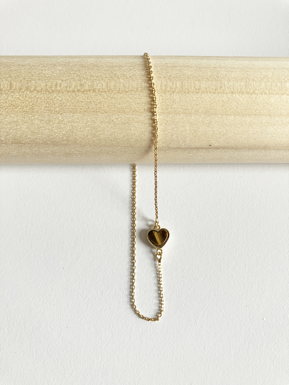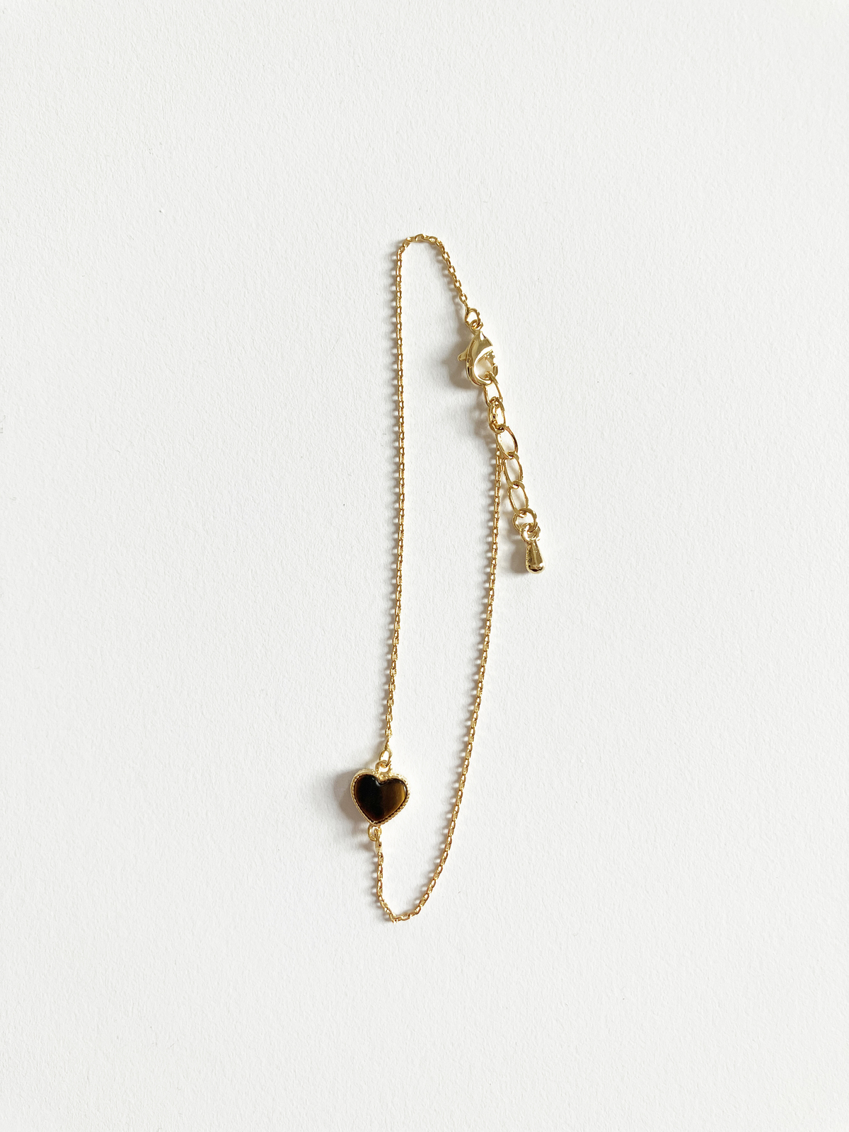 Adorable heart motif bracelet with tiger eye stone set in gold plated non-tarnishing surgical steel on adjustable gold plated non-tarnishing surgical steel chain with a lobster clasp. Pair it with a pendant!