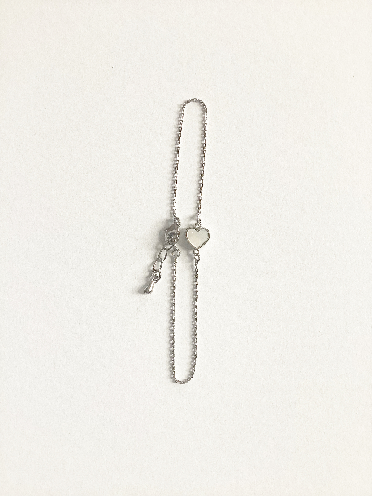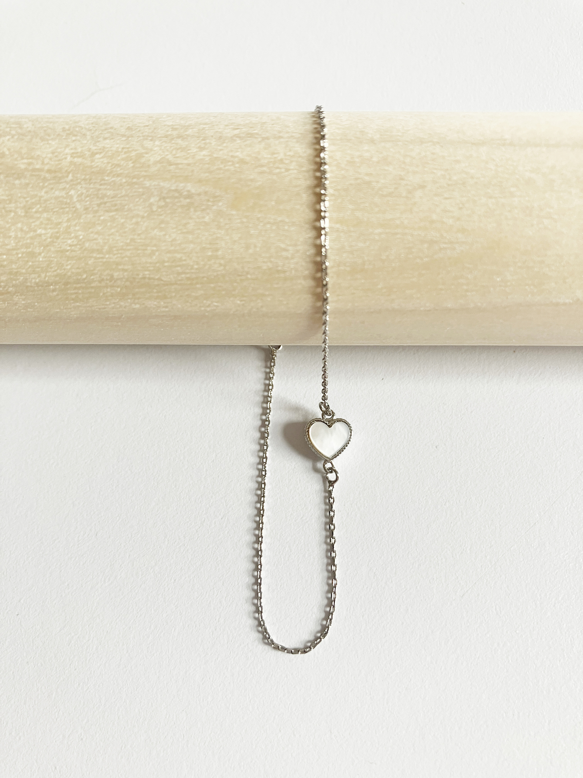 Adorable heart motif bracelet with mother of pearl stone set in silver plated non-tarnishing surgical steel on adjustable gold plated non-tarnishing surgical steel chain with a lobster clasp. Also available in gold!