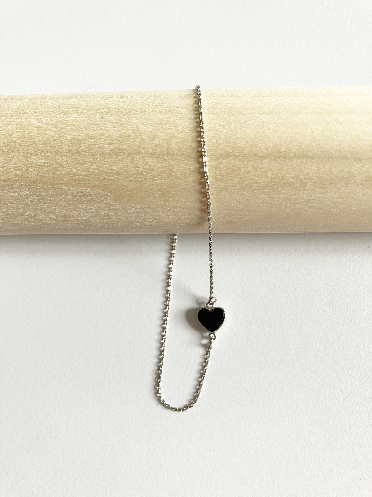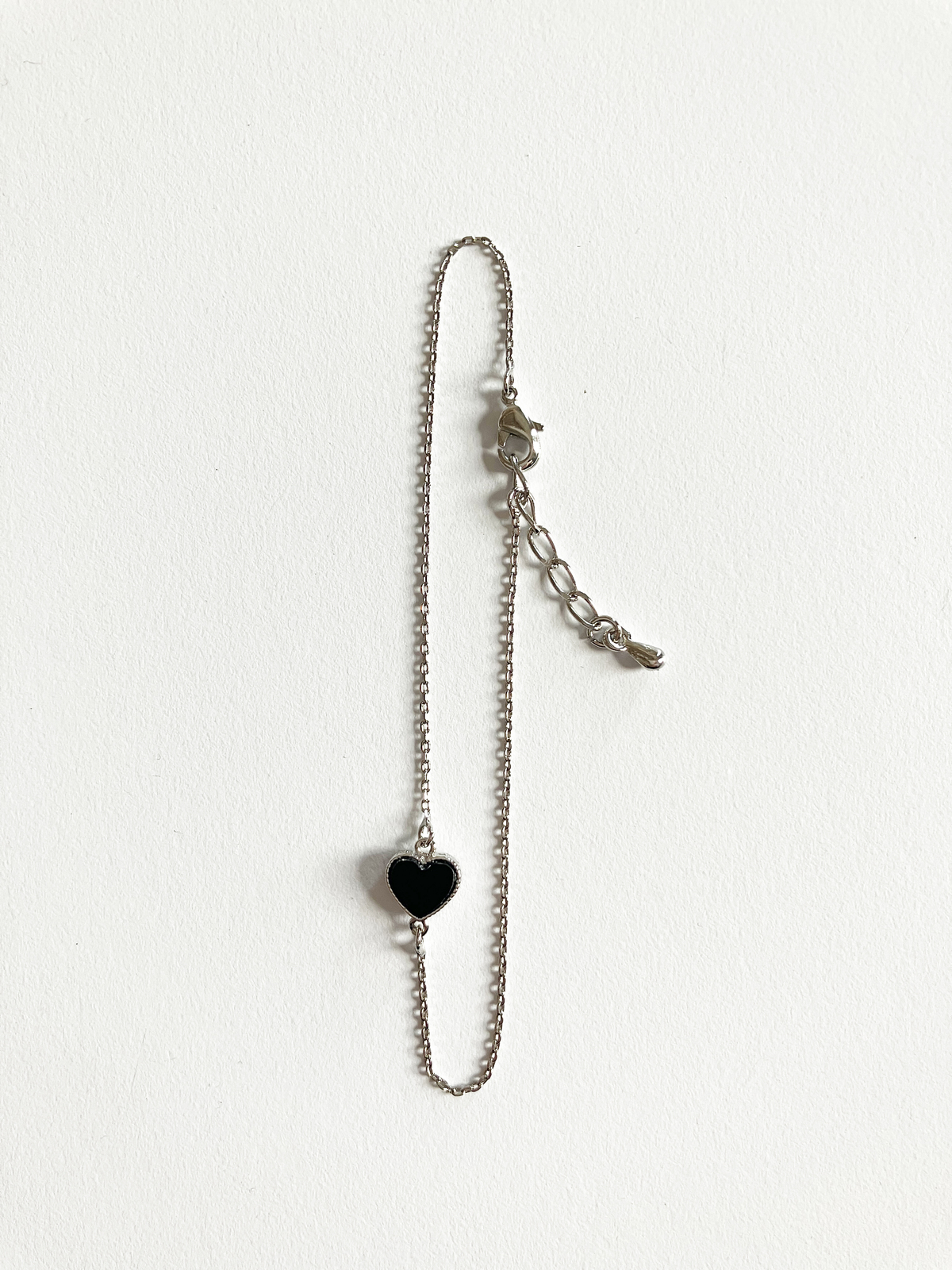 Adorable heart motif bracelet with onyx stone set in silver plated non-tarnishing surgical steel on adjustable gold plated non-tarnishing surgical steel chain with a lobster clasp. Also available in gold!