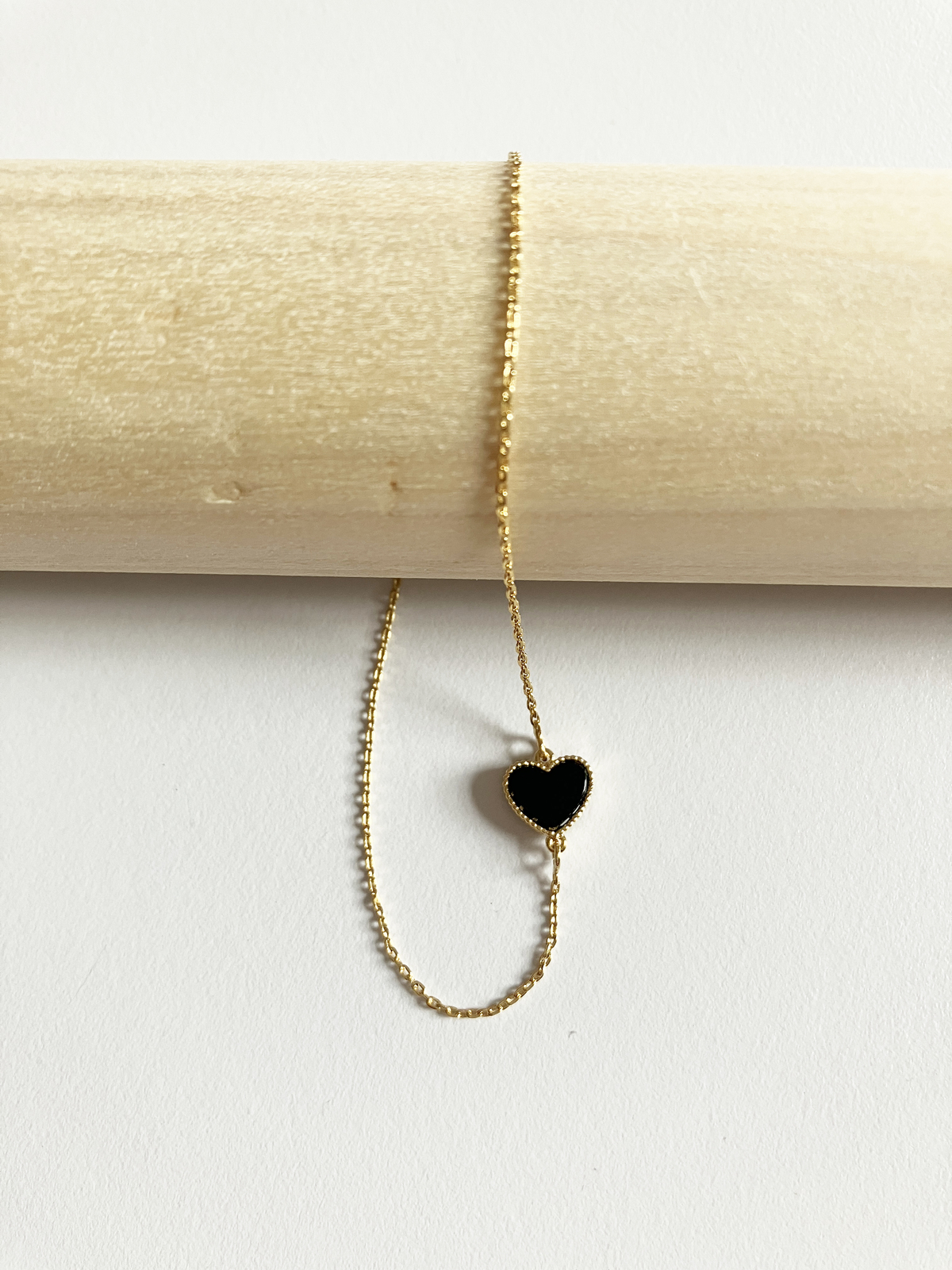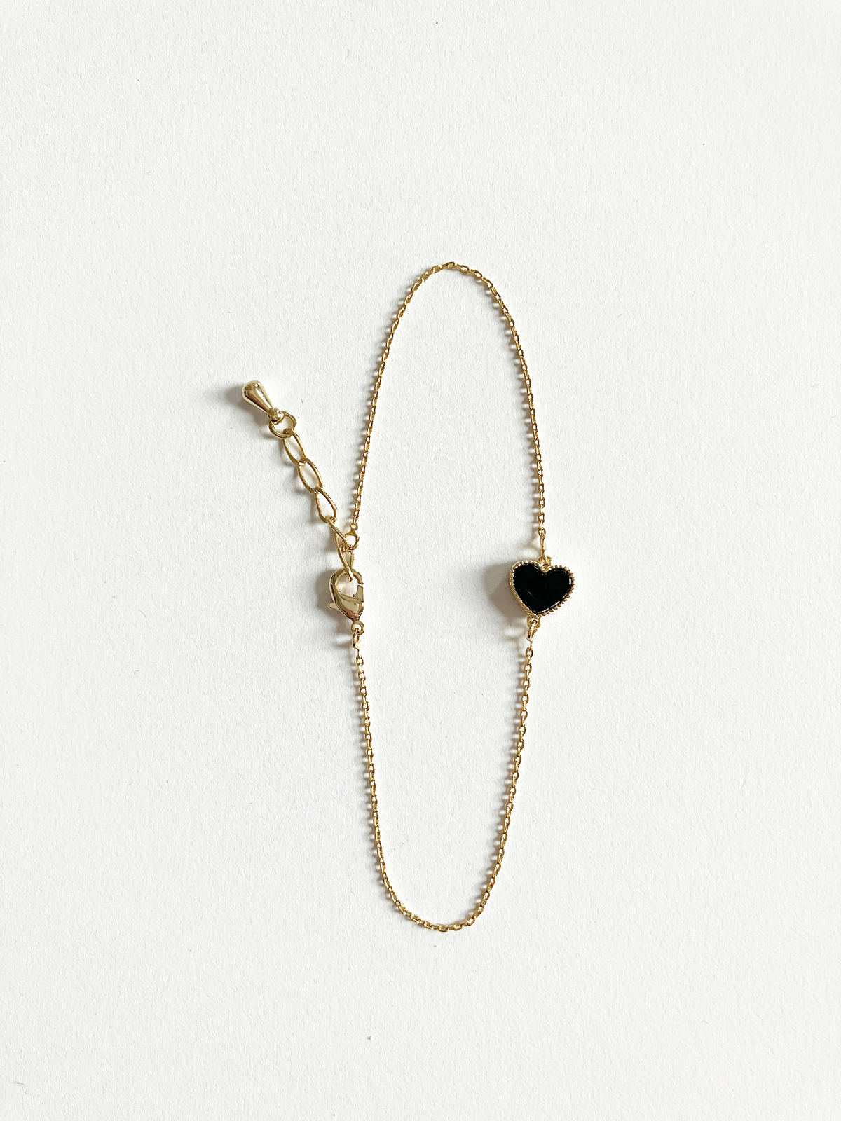 Adorable heart motif bracelet with onyx stone set in gold plated non-tarnishing surgical steel on adjustable gold plated non-tarnishing surgical steel chain with a lobster clasp. Wear it with a matching pendant!
