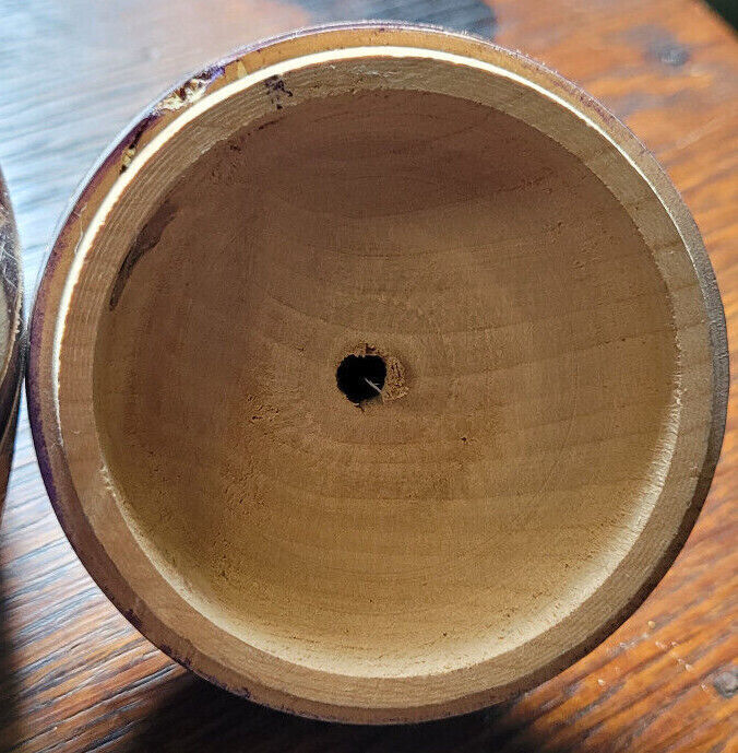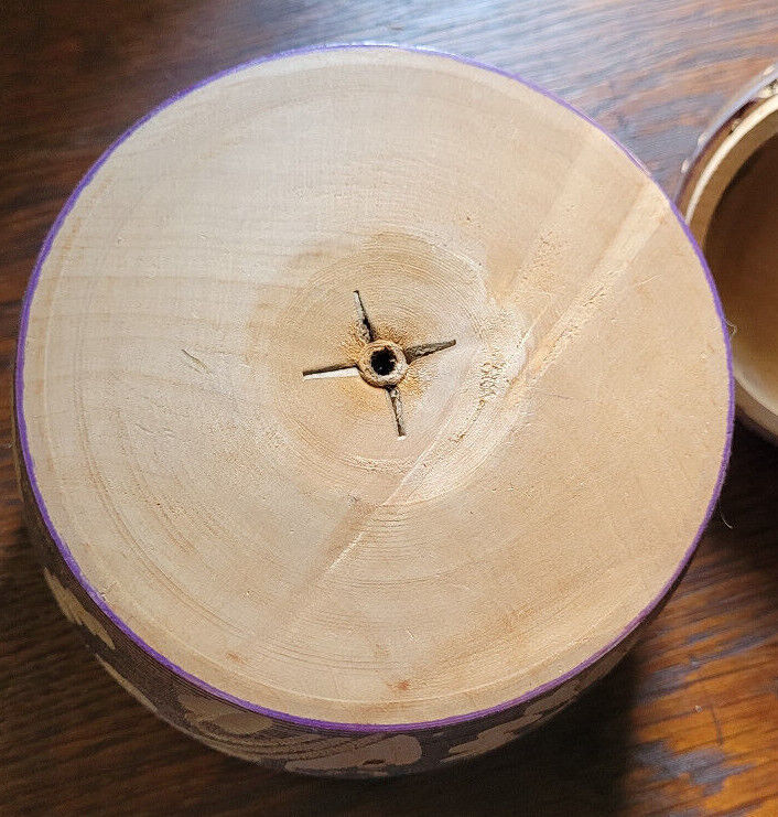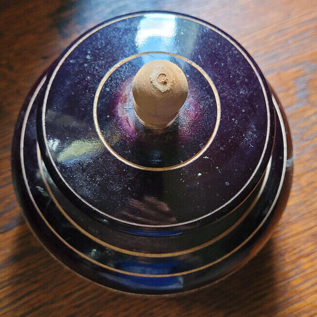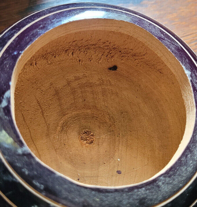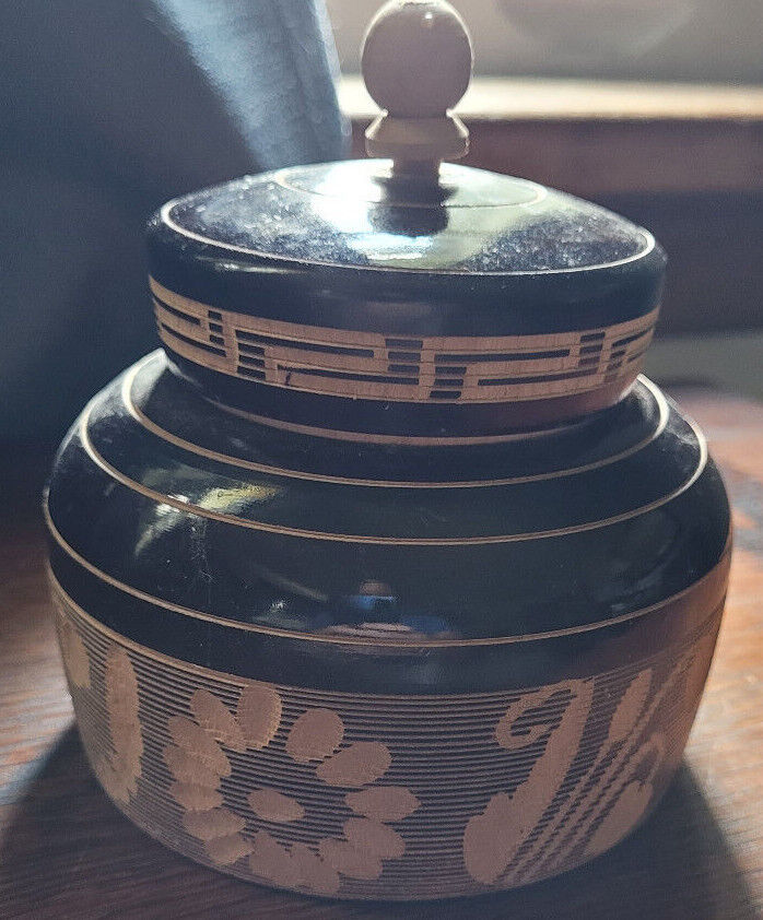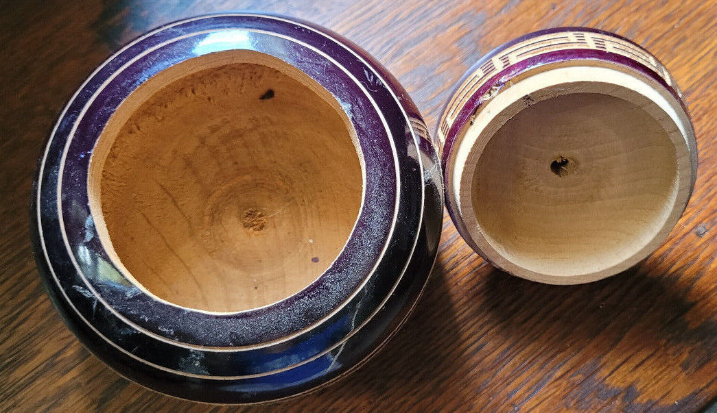 This trinket box is in good used condition. It appears to be hand turned and carved. The lid fits well. The carvings are nice. Measures with the lid 5". 4" wide. Would make a nice addition to a collection.