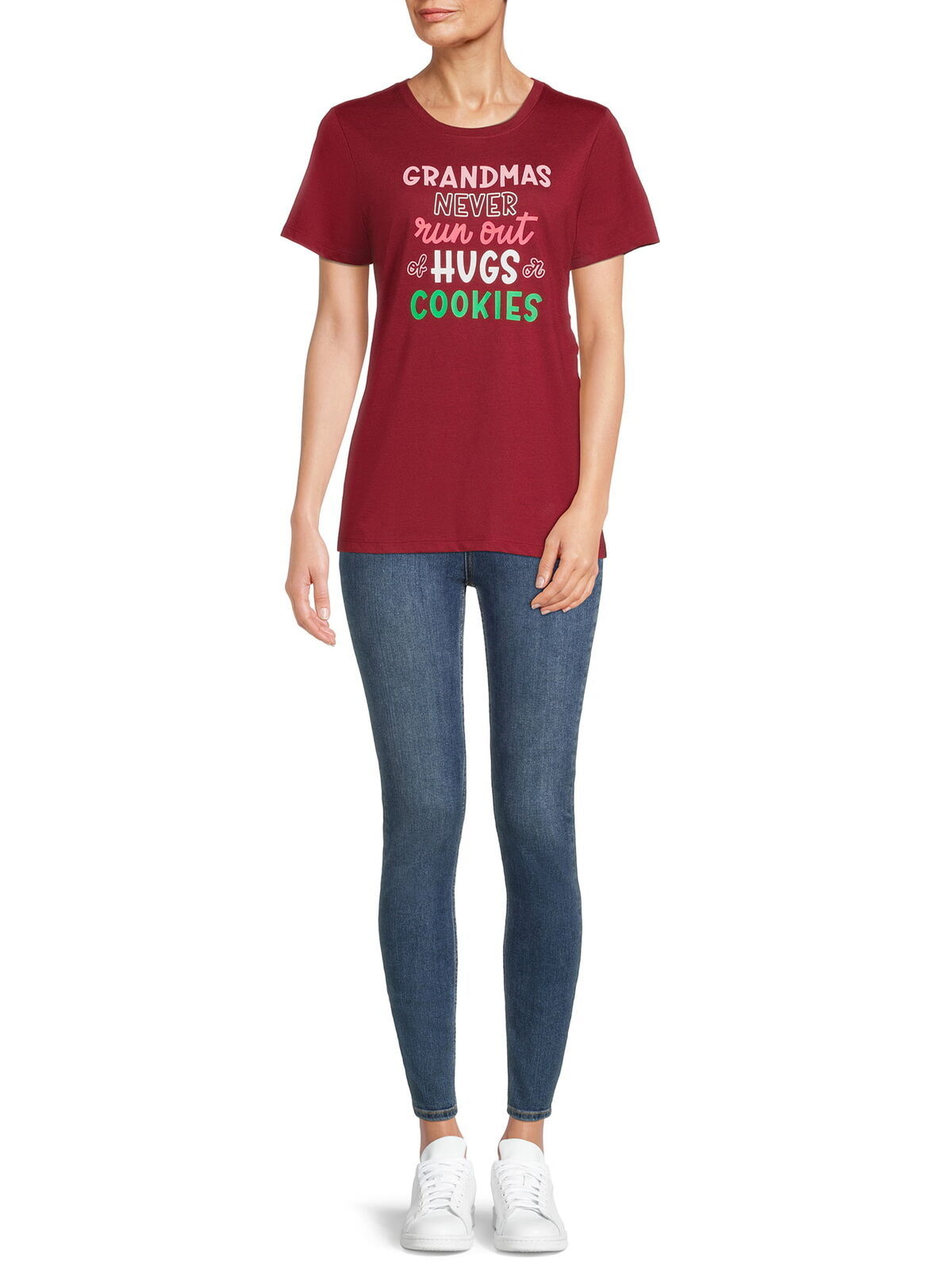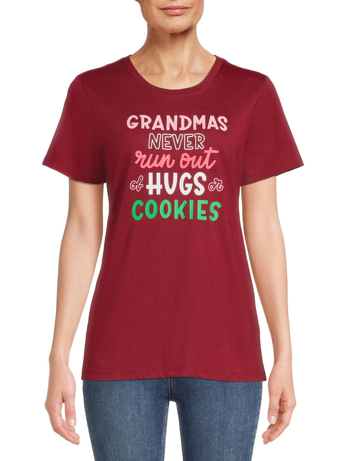 This Way To Celebrate Christmas Grandmas Hugs Womens Graphic T-Shirt is sure to bring that warm, fuzzy feeling. The classic casual style features the sentimental message "Grandmas Never Run Out of Hugs or Cookies," sure to put a smile on grammy's face -- and maybe even win you a pinched cheek and a cookie! With its relaxed fit and straight hem perfect for layering, it'll be a seasonal favorite for spreading the holiday joy.