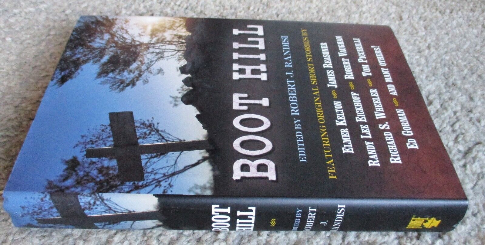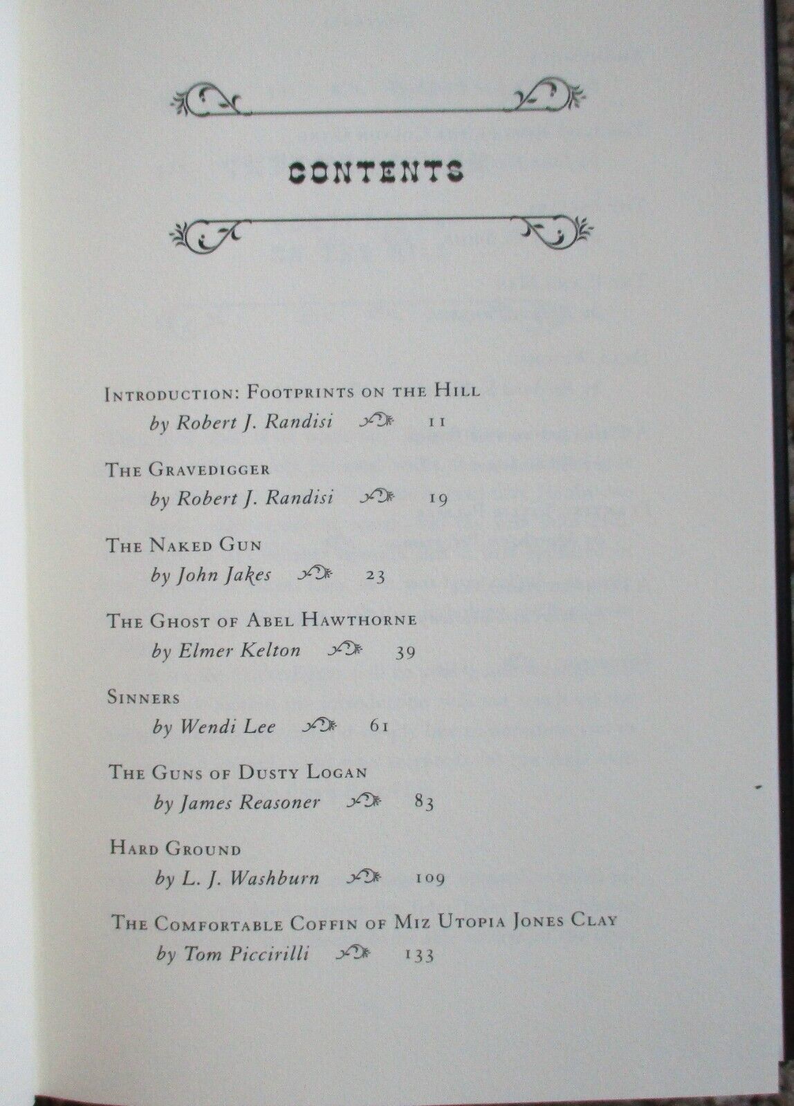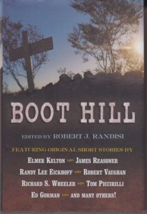 5.75" x 8.5", 351 page hardcover with dustjacket titled BOOT HILL: AN ANTHOLOGY OF THE WEST edited by Robert J. Randisi/ Forge Books, ISBN #0-765-30081-8, First Edition, May 2002/ BOOT HILL is Robert J Randisi's BEST WESTERN ANTHOLOGY to date. A collection of stories from well known authors including John Jakes, Elmer Kelton, James Reasoner, Robert Vaughan, and Richard S Wheeler. Throw in stories by lesser known but equally impressive authors such as Tom Piccirilli and Marcus Galloway and you have a very impressive western anthology. Come along as the Gravedigger tells us the tales behind the head stones of Dodge City's BOOT HILL. This is a tour you won't want to miss.