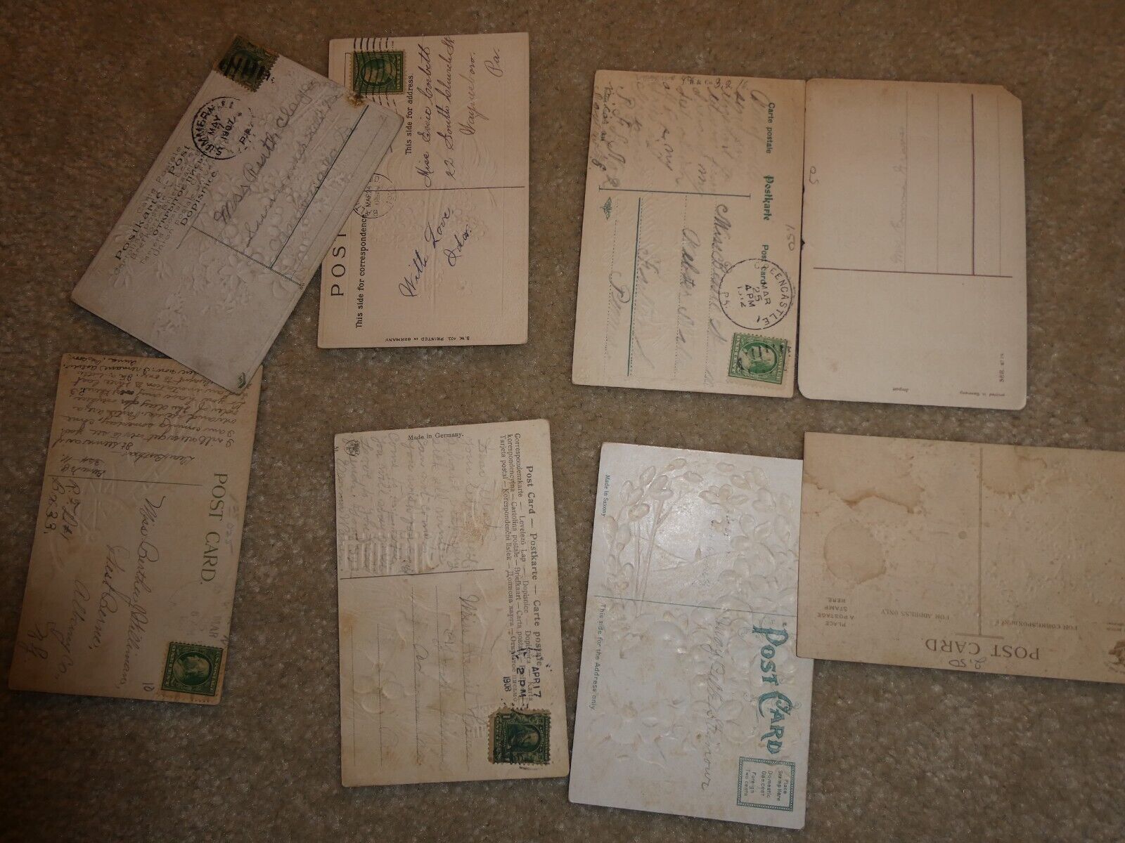 are bidding on a nice, lot of 8 old, dates on the cancelled ones are 1907, 1908, 1911, 1912, old Easter postcards, some litho, some embossed, in the pictures. Nice shape, many are used as shown, light general wear. Neat old cards to frame. Zoom in for details.