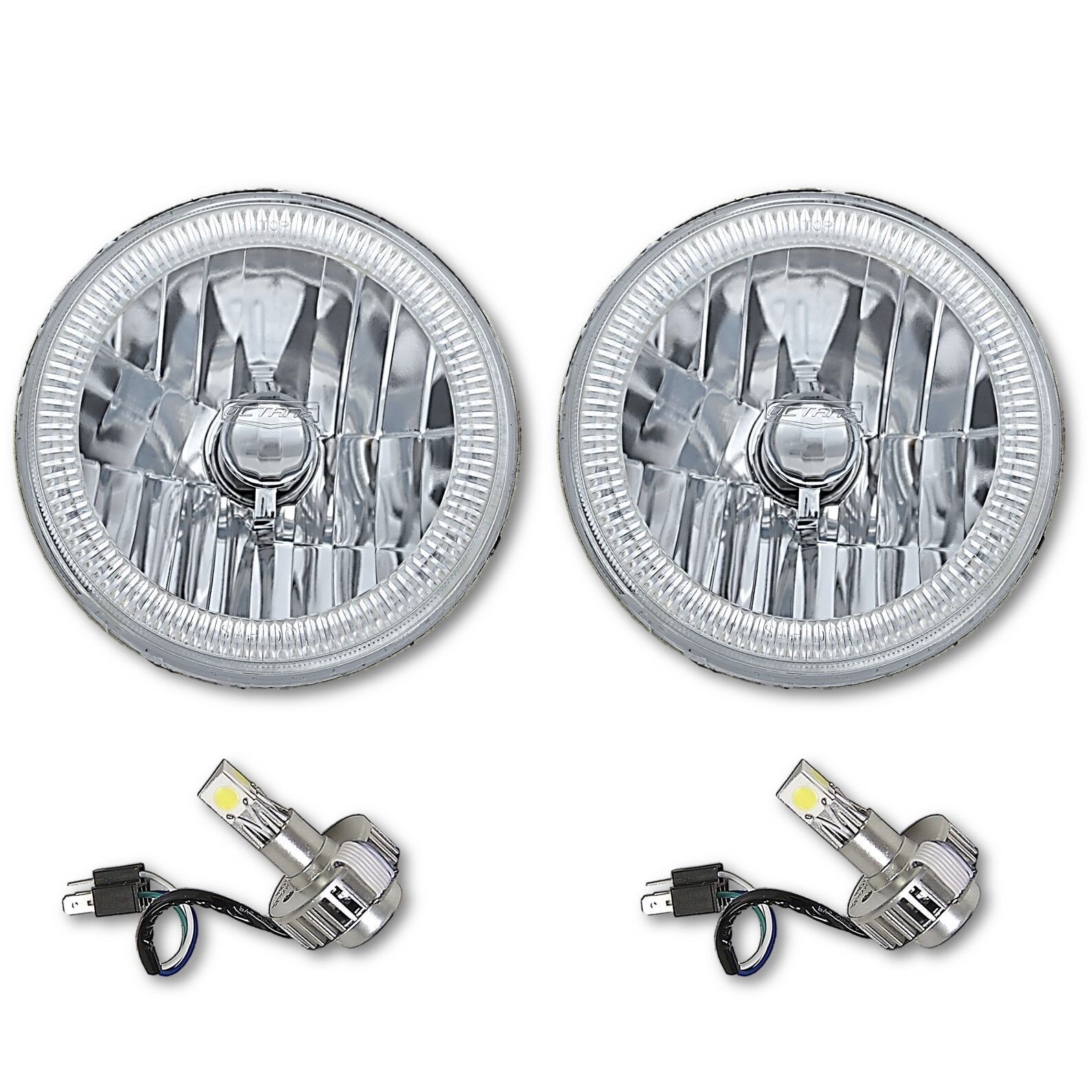 Gen LED xenon 6500k super white LED bulbs and a bluetooth controller. These will fit any vehicle that has 7 inch diameter headlights. The halo rings are powered by 12v power and ground wires. SAE and DOT approved. These are glass and we will take extra care in packaging.