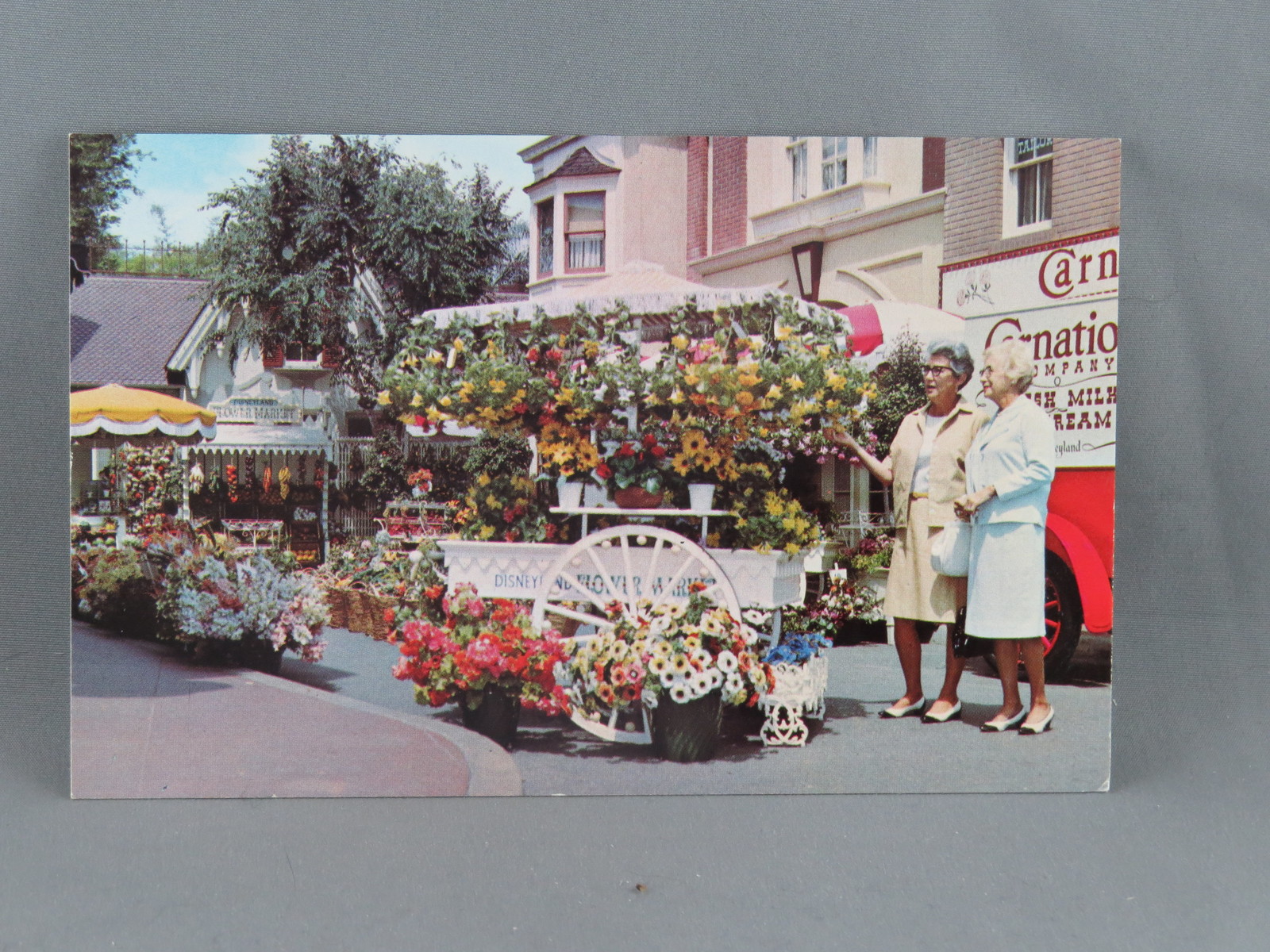 Up for sale is a vintage postcard. It features an image of 2 ladies at a flower cart in the flower mart in Disneyland California. What a great addition to any colleciton.