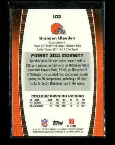 2012 TOPPS FINEST ROOKIE Chrome Football Card #102 BRANDON WEEDEN Cleveland Browns