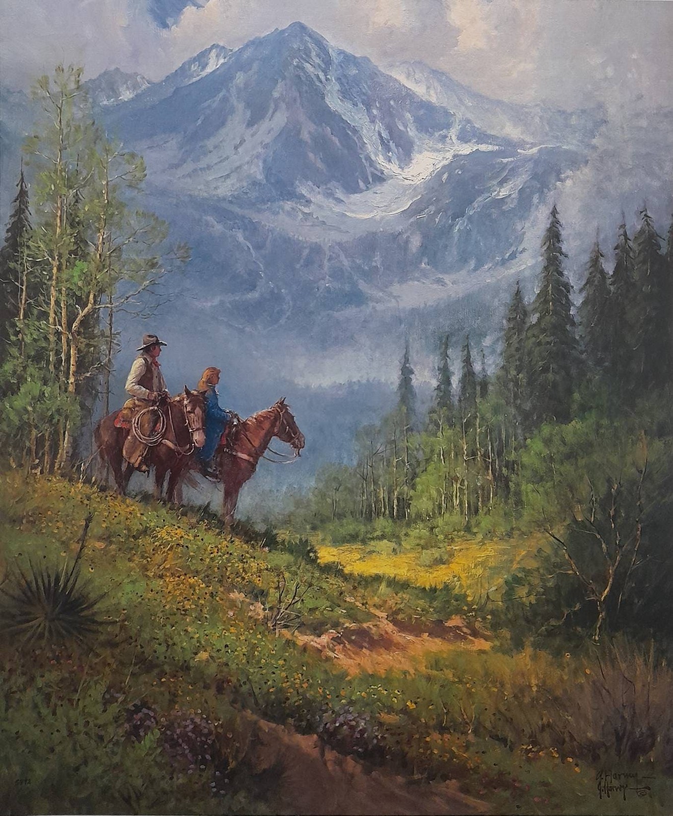Reflecting His Majesty is a numbered limited edition print by G Harvey. This piece depicts a couple on horseback taking in the grandeur of a mountain scene.