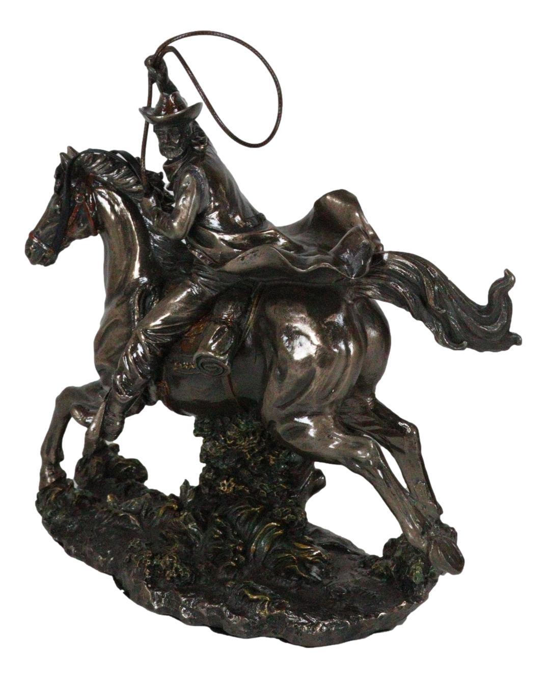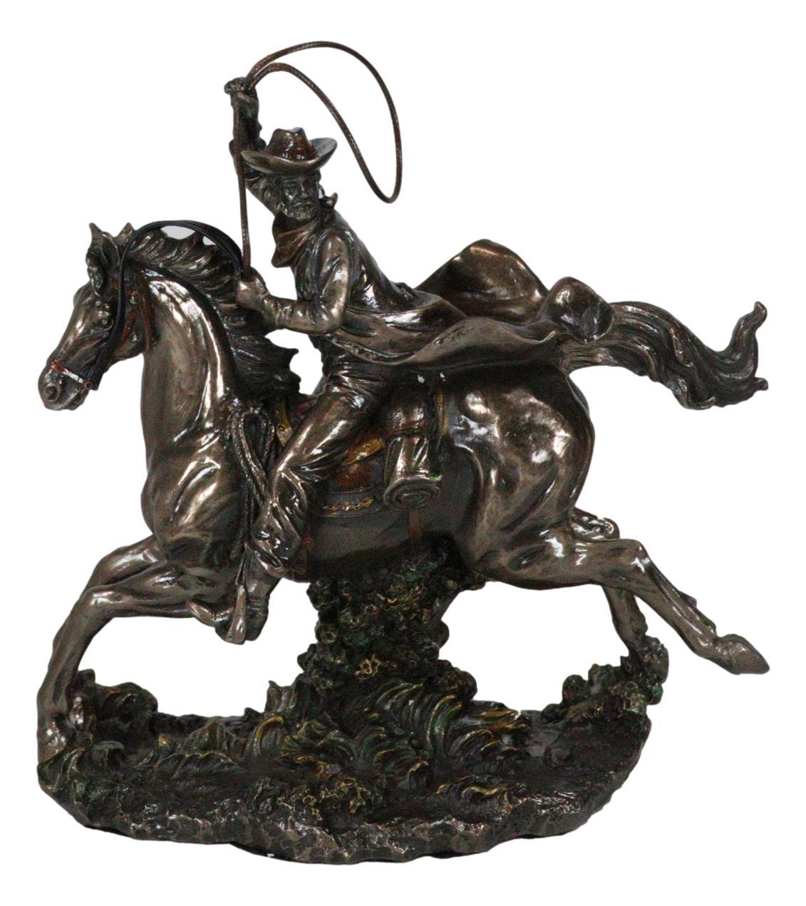 Rustic Western Rodeo Cowboy With Lasso Rope On Running Mustang Horse Figurine